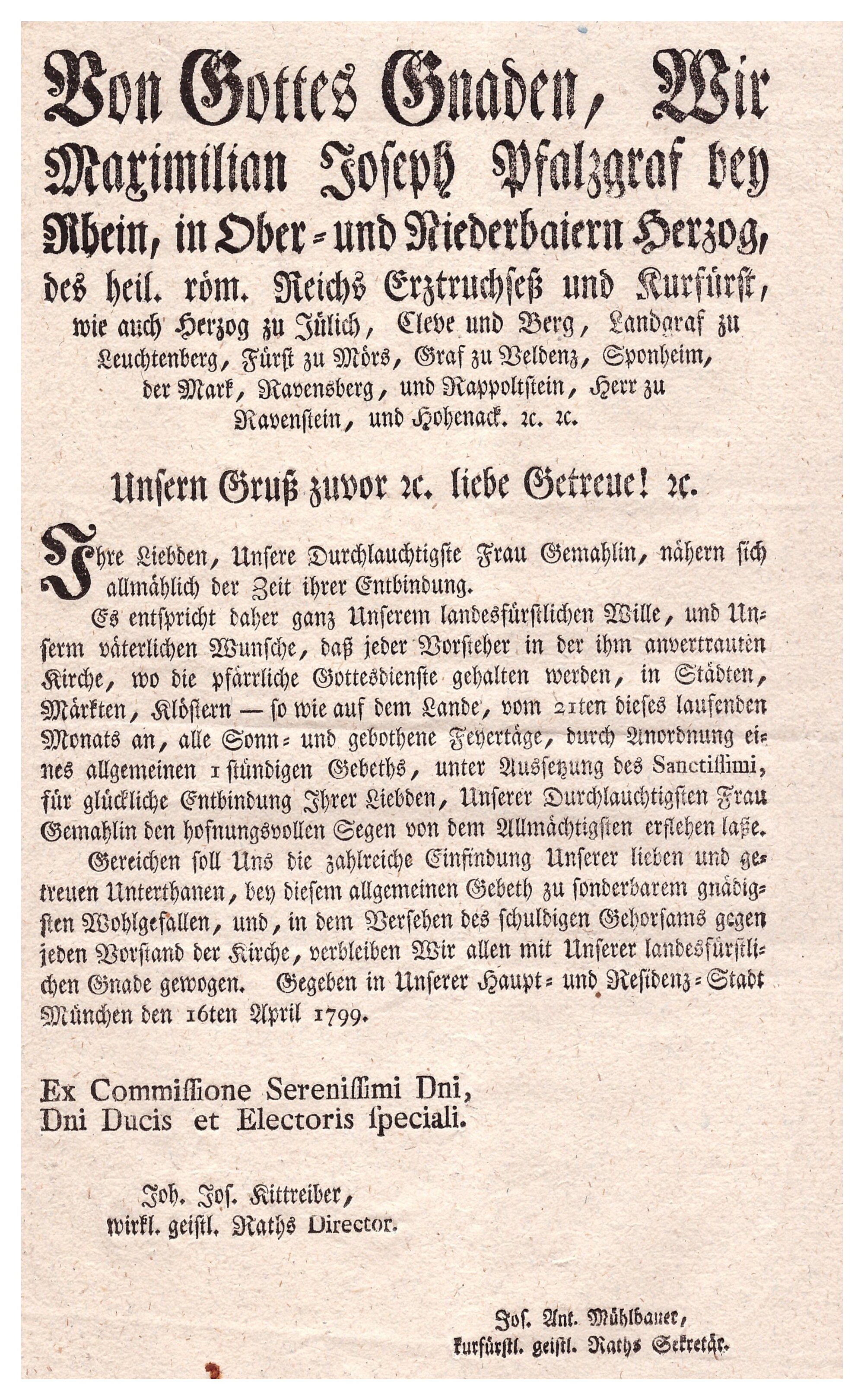 Mandat des Bayerischen Kurfürsten Maximilian vom 16. April 1799 über Gebetsstunden für eine glückliche Schwangerschaft der Fürstin Das Leben der Pfarrgemeinde und des Pfarrers war in früherer Zeit eng mit dem starren Gefüge der Ständegesellschaft verbunden. Wenige Herrscher besaßen umfassende Machtbefugnisse über die überwiegende Masse der einfachen Landbevölkerung. |