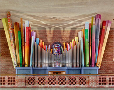 Unsere Schmid-Orgel wurde am 26. Oktober 2008 eingeweiht. Siegfried Schmid ist ein erfahrener Orgelbauer, der seine Werkstatt in Knottenried/Immenstadt hat. Absolutes Neuland war die kühne Gestaltung des Orgelprospekts mit seinen farbigen, schräg stehenden Holzpfeifen. Seine Handschrift hat der Künstler Andreas d`Orfey auf den Orgelpfeifen hinterlassen.