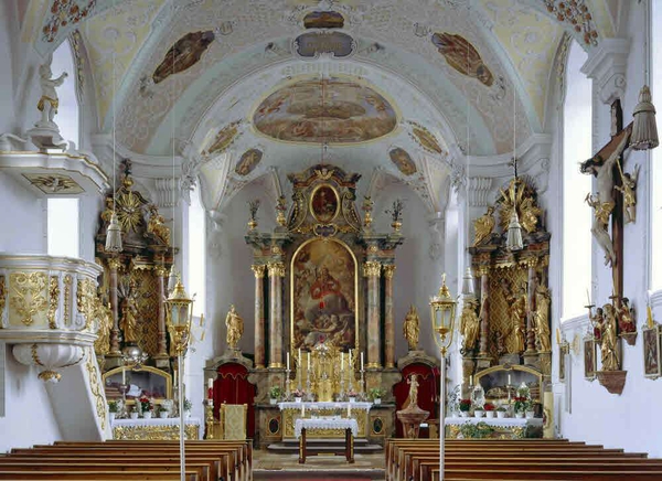 Der 1740 aufgerichtete, 1742 geweihte Hauptaltar, der den Raum beherrscht, wurde von Michael Ötschmann entworfen.
