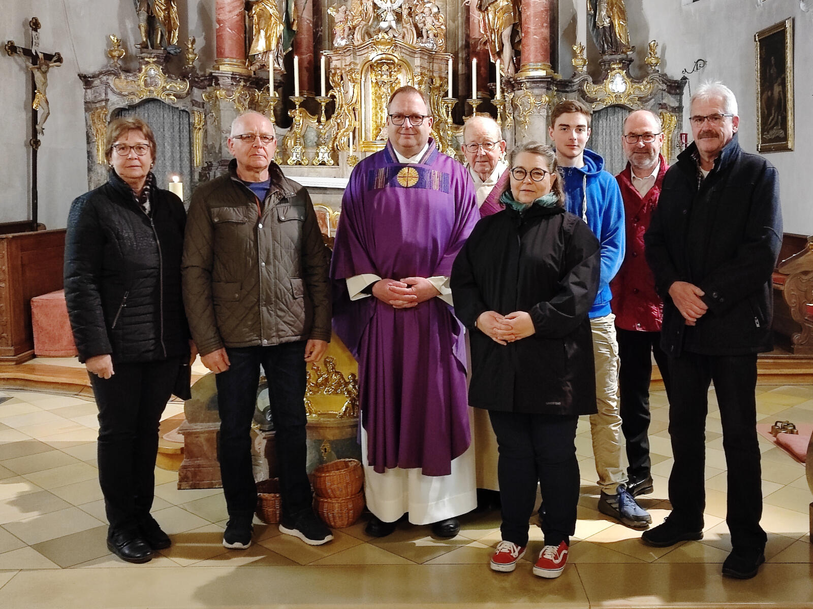Bisherige Hausmeister Gisela und Arnold Zimmermann, Pfarrer Gerhard Krammer, Diakon Bernhard Berchtenbreiter, die neue Hausmeisterin Andrea Endler mit Sohn Felix, Verwaltungsleister Manfred Künzl und Eugen Sindl