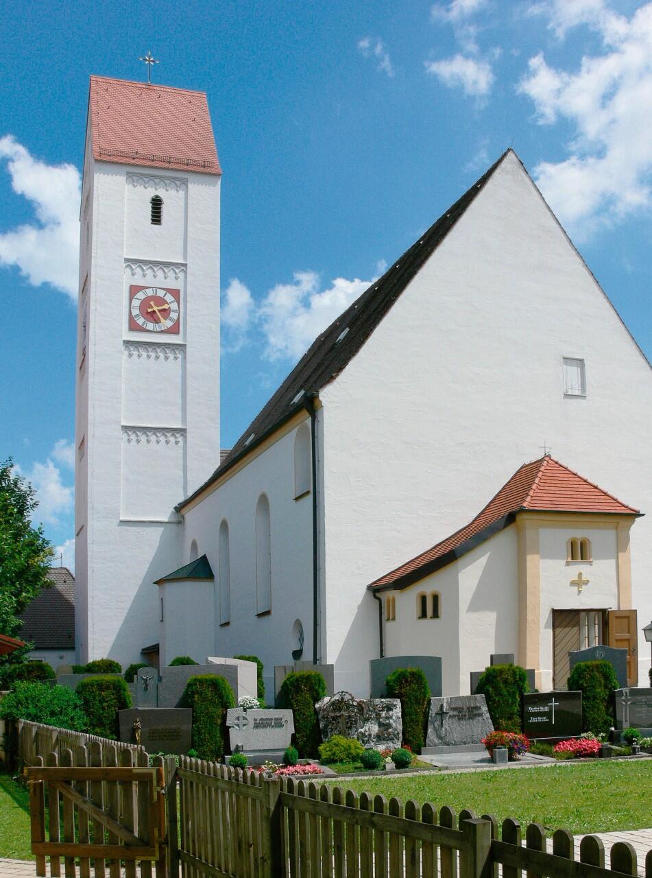 Die Pfarrkirche selbst steht auf einer kleinen Anhöhe in der Mitte des Ortes, umgeben von einem Friedhof. Sie ist ein spätgotischer Ziegelbau, etwa um 1500 samt Turm errichtet. 1747 wurde unter dem kunstsinnigen Pfarrer Augustin Menner (Grabtafel neben dem rechten Seitenaltar) die Pfarrkirche barockisiert (spitzbogige Fenster abgerundet, neue Langhausdecke sowie Chorbogen). Um etwa 1750 erhielt sie ihre reiche Stuckzier. Die Fresken folgten 1753/54. Letzte Innenrenovierungen 1980 und 1995, des Äußeren 1978 sowie 1996.