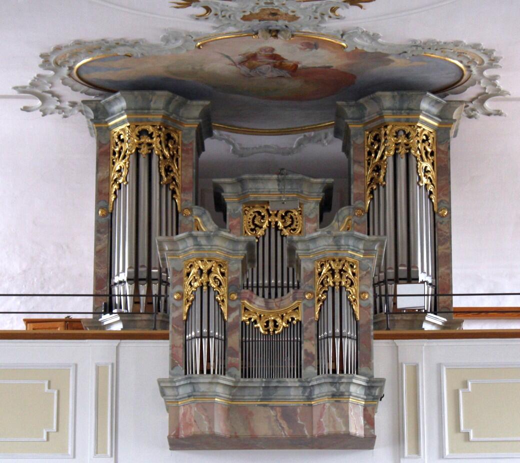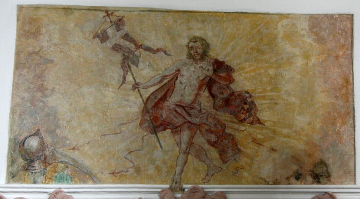 Die Fresken sind ein Frühwerk des bekannten Rokokomalers JOHANN BAPTIST ENDERLE, entstanden 1753/54. Im Altarraum zeigt das große Bild die Verherrlichung des allerheiligsten Altarsakramentes. In diesem Fresko steht Enderle noch ganz unter dem Einfluss seines Lehrers F. M. KUEN, (man vergleiche Kuens Chorfresko in der Pfarrkirche Fischach, Landkreis Augsburg-Land). In der Mitte als Hauptfigur die Mutter Kirche (Ecclesia) auf einem von Evangelistensymbolen gezogenem Triumphwagen. Diese hält eine Monstranz mit Hostie empor, als Zeichen der Gegenwart Jesus Christus. Auf der Rückenlehne die Tiara mit den gekreuzten Schlüsseln – Papsttum. Der Mutter Kirche huldigen die Erdteile: Europa aus Königingestalt, die Paschafigur im blauen Mantel als Asien, der Indianer im Federschmuck als Amerika und natürlich der Schwarze als Afrika. Australien war zu dieser Zeit noch nicht entdeckt. Am unteren Bildrand stürzen die Irrlehrer (allegorische Darstellung von Unglauben, Irrglauben und Ketzerei) vom Blitz der Wahrheit getroffen, der aus der Hostie kommt, in die Tiefe.