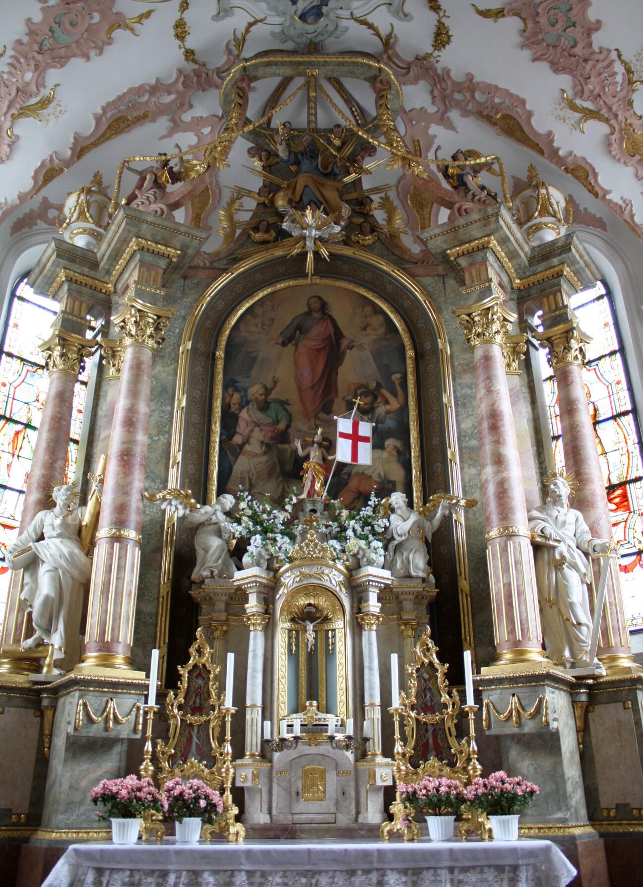 Am Hauptaltar (Stephansaltar), Figuren: oben im Auszug Gott Vater (Mitte 18. Jahrhundert), umgeben von Engelsköpfchen, darunter heiliger Geist, stellen zusammen mit Jesus auf dem Altarblatt die heilige Dreifaltigkeit dar. Zwischen den Säulen stehen links der heilige Petrus und rechts der heilige Paulus von ca. 1720/30. An dem Auszug, neben Gott Vater sitzen ebenfalls zwei Engel. Erwähnenswert sind auch die goldenen Reliquienpyramiden sowie Leuchter aus der Rokokozeit.