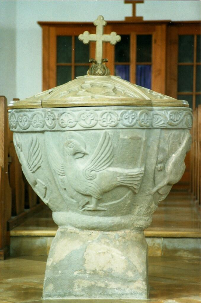 Kostbarstes Ausstattungsstück der Kirche ist der romanische Taufstein (12.Jh.), eine der bedeutendsten romanischen Steinmetzarbeiten dieser Art in Südbayern. In das kelchförmige Becken sind in ganz flachen Reliefs die vier Evangelistensymbole: Adler für Johannes, Stier für Lukas, Löwe für Markus und Engel für Matthäus eingearbeitet.