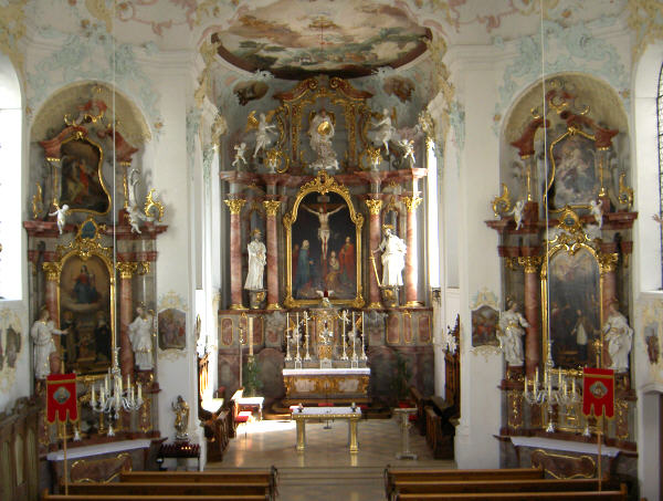 Den Auftrag für den neuen Hochaltar erhielten 1775 die aus der namhaften Türkheimer Schreinerfamilie stammenden Brüder Johann Bergmüller und Franz Joseph Bergmüller, der gerade bankrott war und in der Werkstatt seines Bruders mitarbeitete. Die Fassung des Altars besorgten 1779 die Krumbacher Maler Lukas Schott und Jakob Fröschle (1742-82). Vielleicht stammen auch Kanzel und Gestühl aus der Bergmüllerwerkstatt. Den Zyklus der Apostelfiguren fertigte laut Kirchenrechnungen 1752 ein Bildhauer aus Babenhausen, die Fassung besorgte Schott. – Im Zuge der Kirchenrenovierung des mittleren 19. Jh. schuf Johann Baptist Dollenbacher (1815-66) aus Unterbleichen neue Altarbilder, der Krumbacher Bildhauer Joseph Hilber nach 1890 das Antependium und die Michaelfigur am Hochaltar, sowie Chorgestühl und Pietà. – Bei der letzten Innenrestaurierung 2001/02 hatte die Oberleitung Restaurator Johannes Amann aus Weißenhorn.