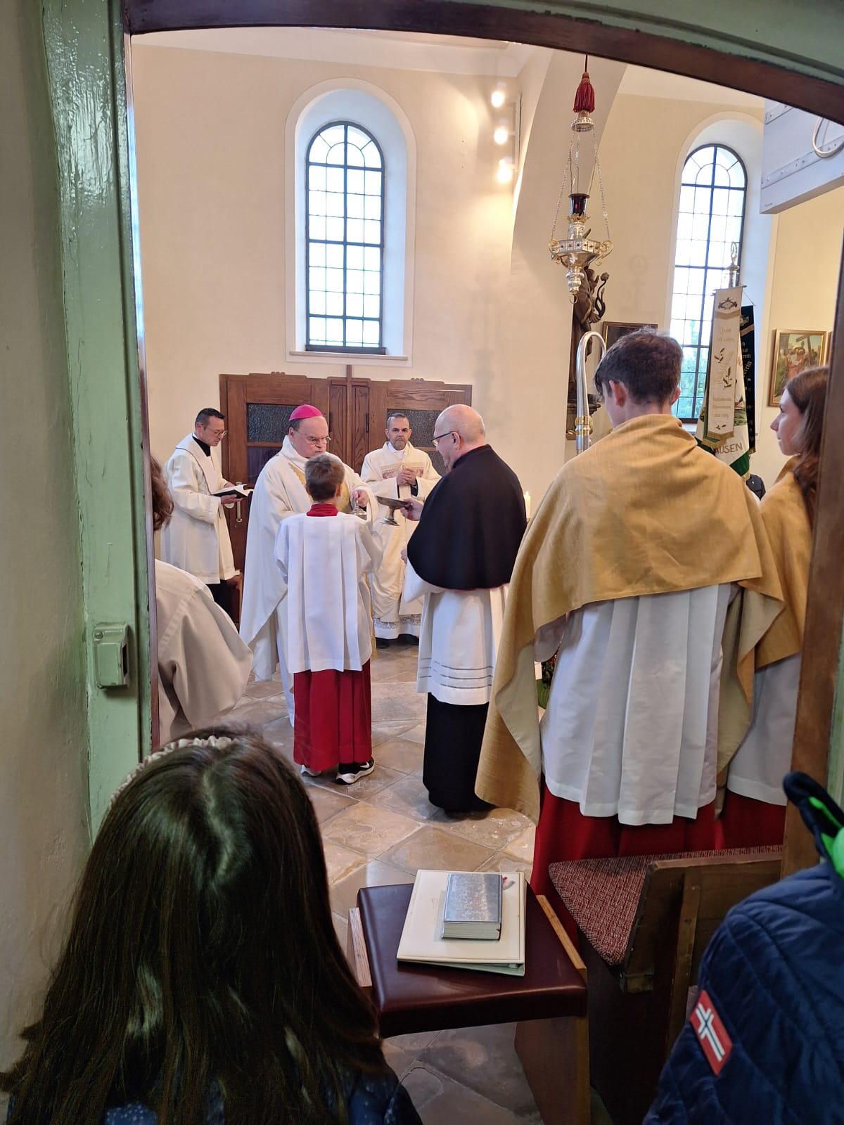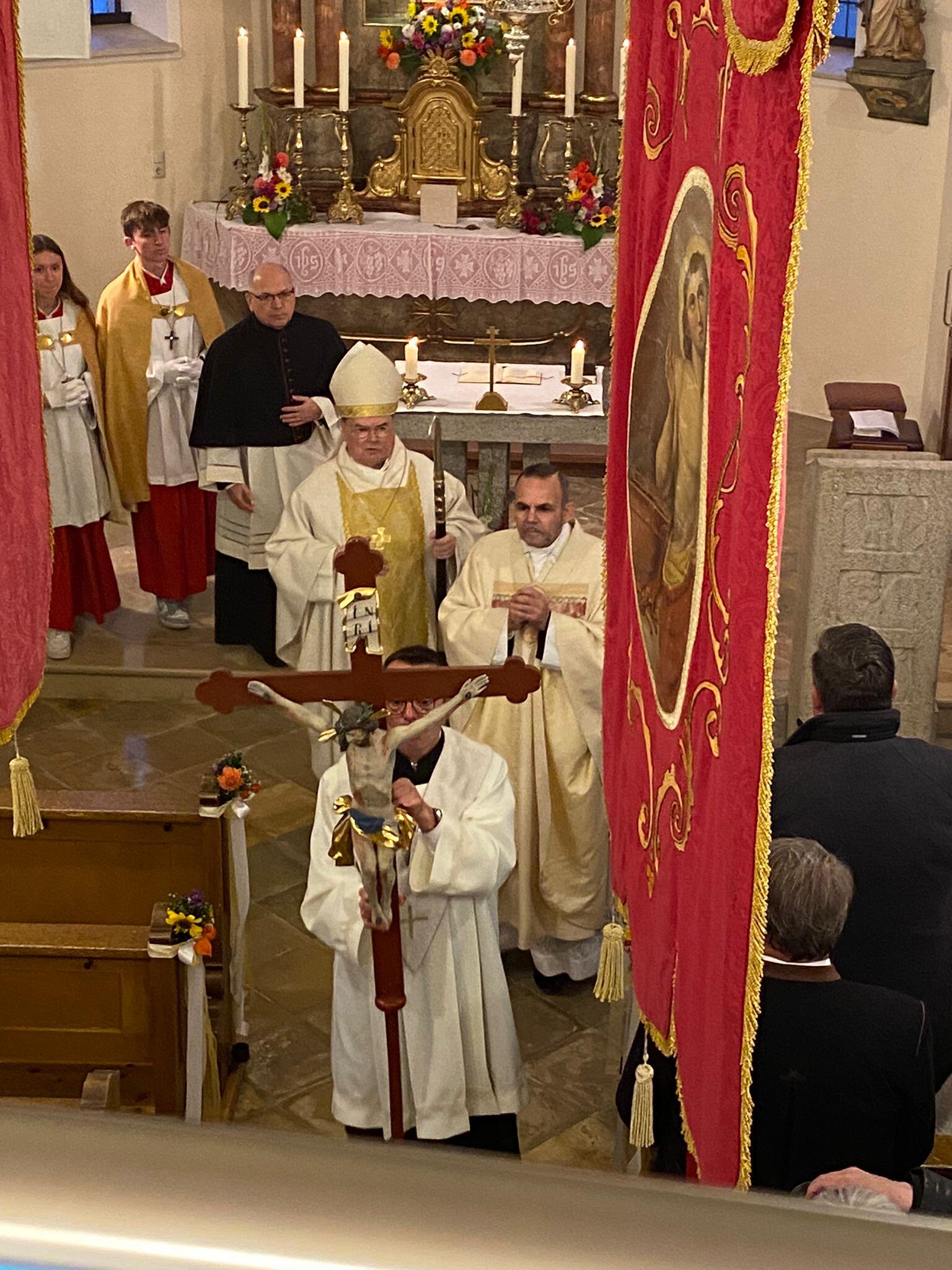 Zwei Schulkinder begrüßten Bishof Bertram mit Blumen und wohlgesetzten Versen, eine Bläsergruppe der Lauinger Stadtkapelle und Michael Finck an der Orgel mit prachtvollen Klängen, die sich dann auch über die Messfeier hin fortsetzten, vereint mit dem Volksgesang.