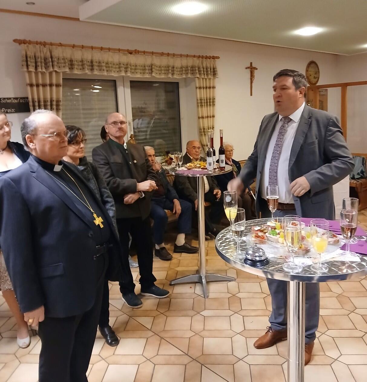An der genannten Bibelstelle ist aber auch von zwei Männern außerhalb der 70er-Gruppe die Rede, über die der Geist Gottes ebenfalls gekommen war. Die Lehre daraus für heute, so der Prediger: Auch über Leute, die beispielsweise nicht zum Gottesdienst kommen oder sonstwie aus dem gängigen Raster fallen, aber den Willen Gottes erfüllen, sollen sich die Gläubigen freuen. Dennoch darf deshalb der Besuch des Gemeinde-Gottesdienstes nicht als überflüssig erachtet werden, denn dort ist die Anwesenheit Christi zugesichert. Der Geist jedoch weht, wo er will, und es führen so viele Wege zu Gott, wie es Menschen gibt. Von allen kann Gottes Stimme gehört werden. Entscheidend ist, dass jeder und jede dann auch lebt, was er oder sie vom Evangelium verstanden hat. Bischof Bertram Meier schloss mit Glückwünschen an die Gemeinde und ermutigte sie zur Zuversicht: Wenn sie vom Geist erfüllt ist, wird auch ihr Angesicht neu. Wie das bereits erneuerte Gesicht des materiellen Kirchengebäudes Gestalt annahm und wer sich daran mit welcher Leistung verdient gemacht hat, stellte Kirchenpfleger Maximilian Bauer detailliert da. Dabei dankte er auch neben vielen anderen Tanja Balletshofer vom Architekturbüro Hienle und Tretter, den überregionalen und kommunalen Zuschussgebern, vertreten durch Bürgermeisterin Katja Müller und Landrat Markus Müller, allen Spendern und Arbeitshelfern und der ständig für die Kirche sorgenden Mesnerin Dora Bertenbreiter. Den Dank, dem ihm auch selbst für die eindrucksvolle Beschreibung des Renovierungsprozesses gebührte, statteten ihm Kirchenbesucher mit kräftigem Applaus ab.