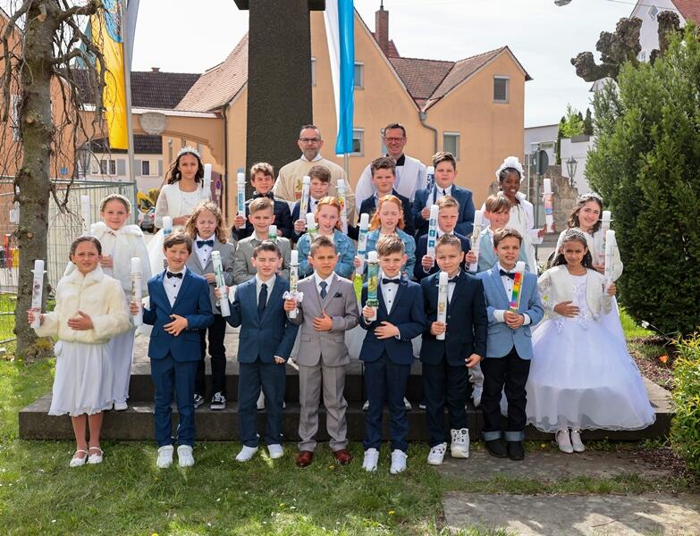 Am 14. bzw. am 21. April 2024 traten unsere diesjährigen Erstkommunionkinder zum ersten Mal an den Tisch des Herrn, um den Leib Christi zu empfangen. Das Thema der diesjährigen Erstkommunionfeier lautete "Ich habe euch auf Adlerflügeln getragen...". Einige Eltern visualisierten das Thema mit einem imposanten Adlerhorst mit einem Adler in Lebensgröße. Die Kinder gestalteten die Adlerfedern zusammen mit einem Foto des jeweiligen Kindes. Für unsere 44 Kommunionkinder war es ein festliches, freudenvolles Ereignis, auf das sie ein Leben lang in guter Erinnerung zurückblicken können.