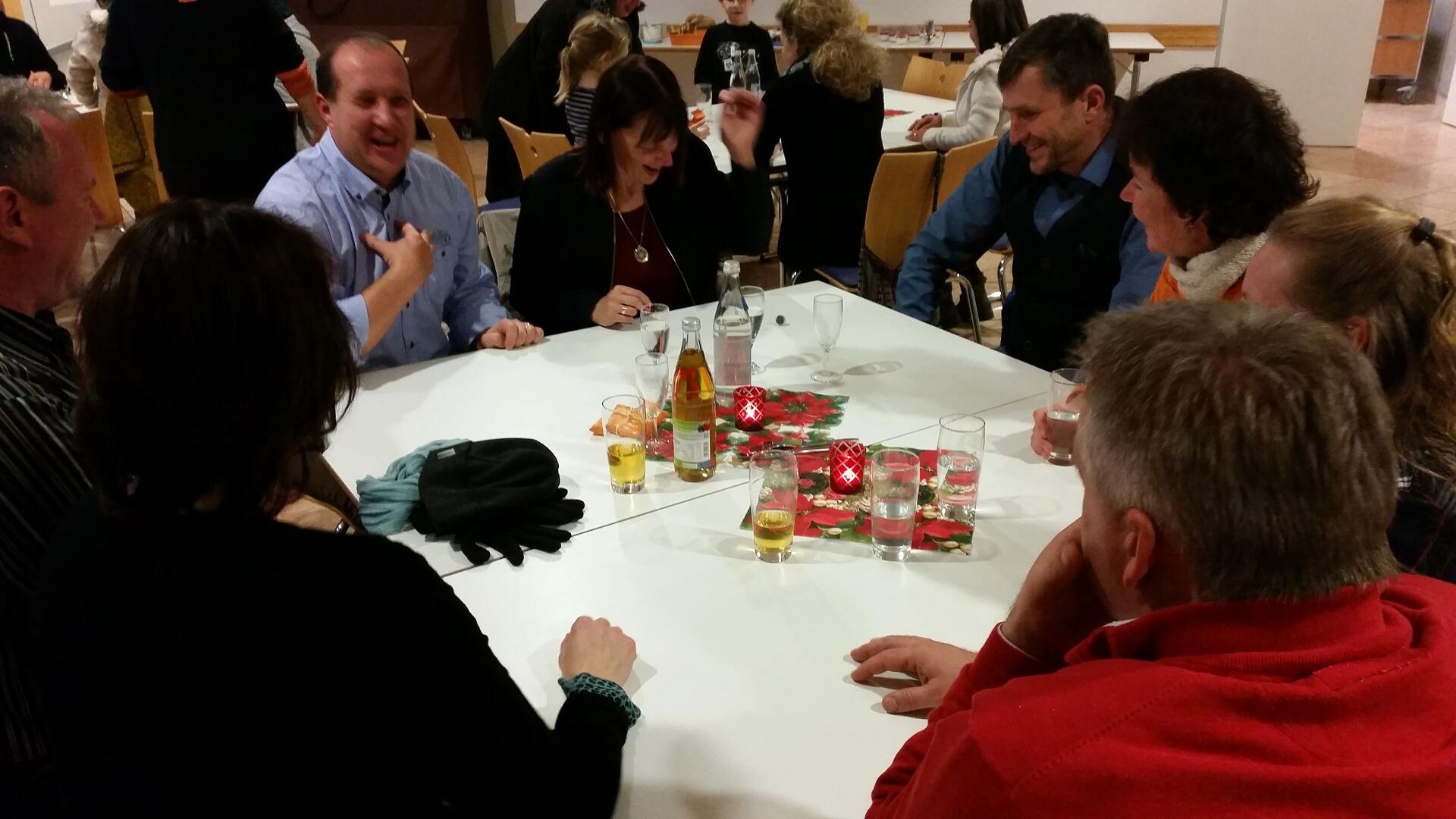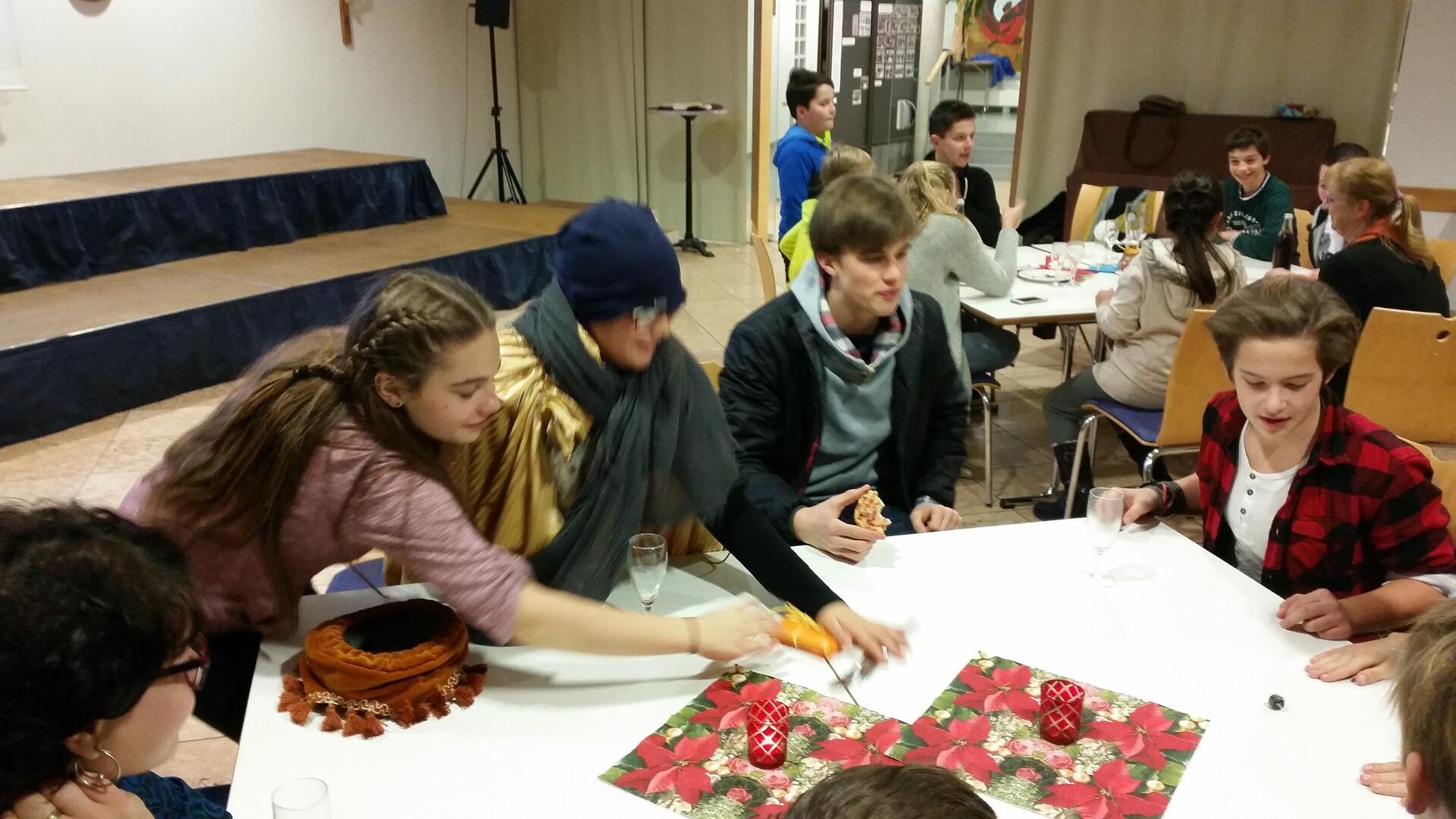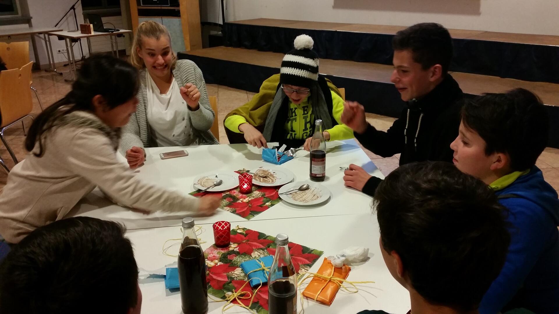 Zu einer festen Tradition entwickelt sich die Neujahrsparty der Lauinger Ministranten: Nach dem erfolgreichen Start im vergangenen Jahr kam es heuer am 04. Januar zu einer Neuauflage. Zahlreiche Ministranten und Ministrantinnen der Martinspfarrei folgten der Einladung von Stadtpfarrer De Blasi ins Pfarrheim, wo sie zusammen mit Eltern und Geschwistern einen kurzweiligen Abend verbrachten (die ebenfalls eingeladenen Hunde, Katzen u.ä. waren seltsamerweise leider zu Hause geblieben…). Nach einem Begrüßungssekt (selbstverständlich in altersgerechter Ausführung für die Kinder!) dankte Pfarrer De Blasi den Minis für ihren treuen Dienst und den Eltern für ihre Unterstützung. Dann eröffnete er das Buffet. Neben einem bereitgestellten „Grundstock“ an verschiedenen Pizzen und Getränken hatten sowohl Eltern als auch größere Minis selbstgemachte Speisen mitgebracht, so dass kulinarisch kaum Wünsche offen blieben. Eine kleine Spielerunde gefiel nicht nur den Minis, sondern, was die Photos beweisen, auch den Erwachsenen. Nachdem im vergangenen Jahr die humorvolle Schilderung des Alltags in einem anglikanischen Pfarrhaus in England viele begeistert hatte, wählte Pfarrer De Blasi in diesem Jahr als „Bildungsprojekt“ den Kultfilm „Don Camillo und Peppone“ aus; obwohl schon Jahrzehnte alt und von den Erwachsenen oftmals gesehen, faszinierte dieser Film Jung und Alt. Fazit des Abends: Fortsetzung unbedingt notwendig und erwünscht!