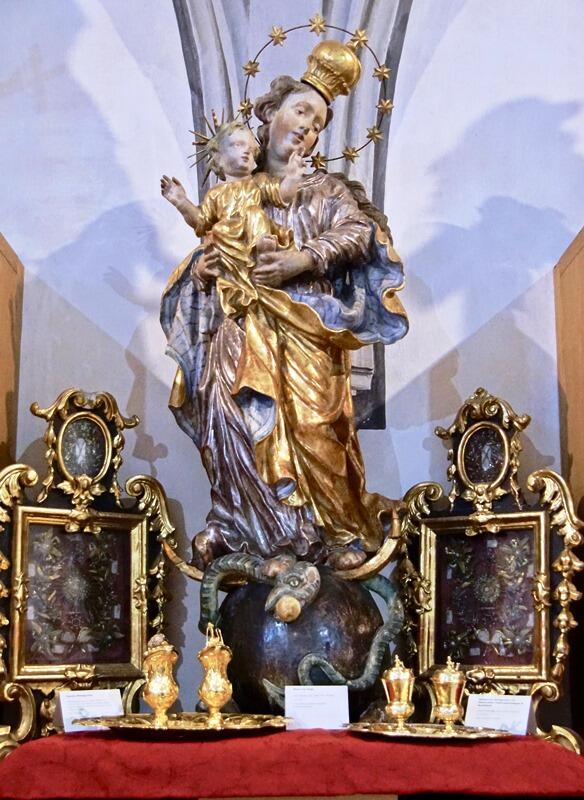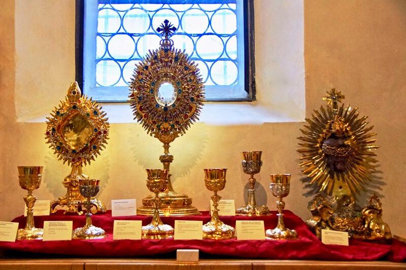 So konnten an diesem Tag sowie am darauffolgenden Sonntag in der Sakristei Exponate aus der 500jährigen Geschichte des Martinsmünsters bestaunt werden. Dr. Schmid betonte in seinen Eröffnungsworten: „Der Kirchenschatz von Lauingen ist etwas sehr Schönes. Da sind Kostbarkeiten dabei von Augsburger Gold- und Silberschmieden, aber auch von Lauinger Meistern.“ So bot sich den Besuchern der Ausstellung eine Augenweide an historischen Paramenten, Figuren, Kelchen und anderen liturgischen Geräten dar.