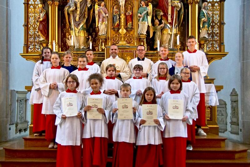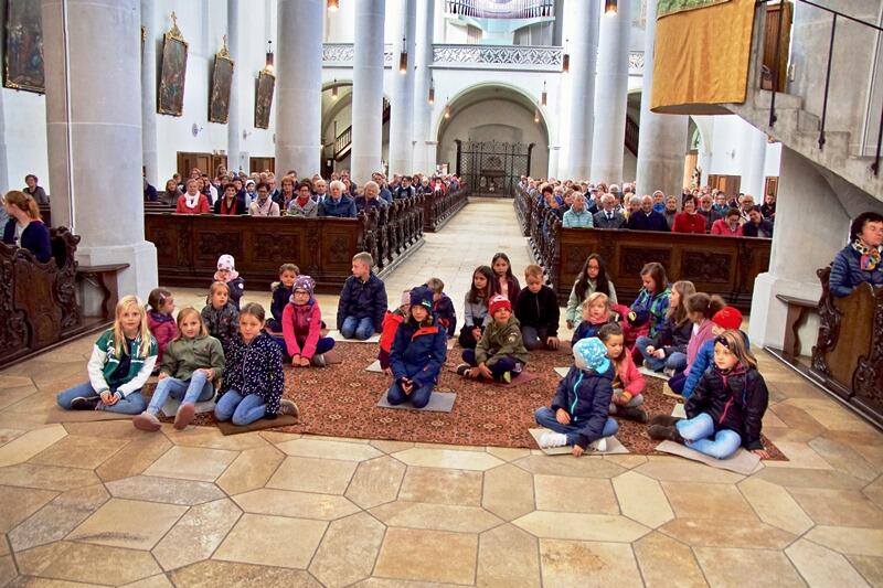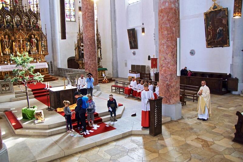 „Es ist spitze, dass du da bist“ war dann auch der Titel des Eröffnungslieds des Gemeinde- und Familiengottesdienstes, der von der Jugendstadtkapelle erstklassig musikalisch umrahmt wurde. Neben zahlreichen Familien nahmen insbesondere Frauen und Männer des Jahrgangs 1942 an dem Gottesdienst teil, was sich in einem ausgefüllten Gotteshaus widerspiegelte; bewusst ein Gottesdienst für Jung und Alt.Sodann wurden vier Mädchen und ein Bub unter die Ministranten aufgenommen und für ihren zukünftigen Dienst gesegnet. Ein weiterer Junge, der krankheitsbedingt nicht anwesend war, wird ebenfalls die Lauinger Ministrant*innen bereichern. Das Evangelium vom barmherzigen Vater wurde von Ministrant*innen und weiteren Kindern der Pfarrgemeinde bravourös in Form eines Pantomimenspiels vorgetragen. Alle anwesenden Kinder wurden eingeladen, vorne auf einem großen Teppich Platz zu nehmen, um das Nachspiel des Evangeliums hautnah mitzuerleben. In der sich anschließenden Predigt legte Stadtpfarrer De Blasi das Evangelium familiengerecht aus, mit dem Fazit, dass Gott alle Menschen als eben der barmherzige Vater in seine Arme aufnimmt. Wir alle sind von Gott angenommen, seine Tür stehe uns stets offen. Auch die Fürbitten wurden von Kindern, jeweils unter Vorzeigen eines entsprechenden Symbols, vorgetragen. Nach dem spektakulären Auftakt war es ein sehr schöner Gottesdienst, in dem die Kinder im wahrsten Sinne des Wortes im Mittelpunkt standen.