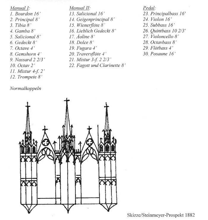 Bei der großen Kirchenrenovierung 1880 muss die Rokoko-Orgel dem Zeitgeist weichen. Die Pfarrei bestellt bei einem der damals renommiertesten Orgelbauer, bei der Firma G. F. Steinmeyer aus Oettingen, eine neue Orgel mit 30 Registern, zwei Manualen und Pedal. Deren Disposition lautet (zum Vergrößern auf das Bild klicken):