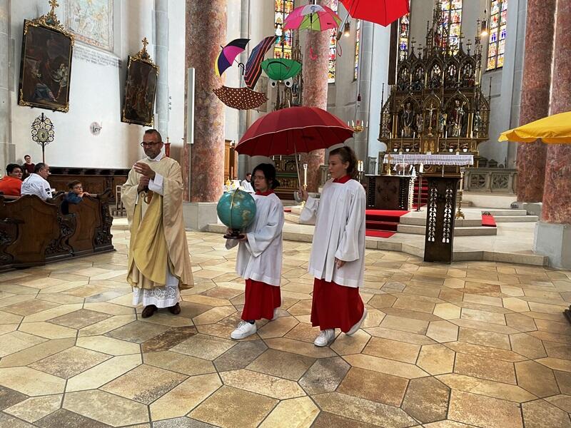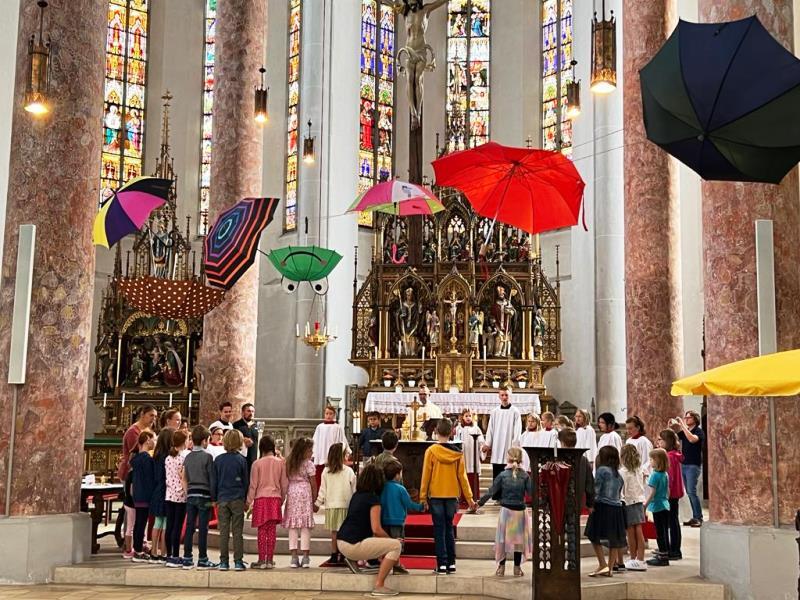 Unter dem Motto "Du bist mein Schirm" feierten Jung und Alt am 17. September 2023 einen Familiengottesdienst zum Beginn des neuen Schuljahres. Das Martinsmünster beeindruckte durch seine farbenfrohe Dekoration mittels Sonnen- und Regenschirmen.