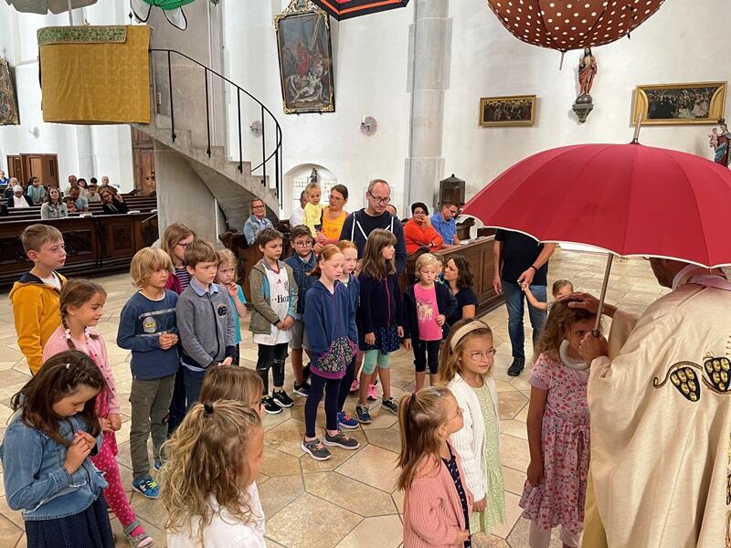 Im Laufe des Gottesdienstes kam klar zum Ausdruck: Wir stehen alle unter dem Schutz Gottes; er ist unser Schirm. In besonderer Weise wurden die Kinder im wahrsten Sinne des Wortes unter den Schutzschirm Gottes gestellt: Unter einem ausgespannten Schirm, den er in seiner Linken hielt, erteilte Stadtpfarrer Raffaele De Blasi den Kindern den Einzelsegen.