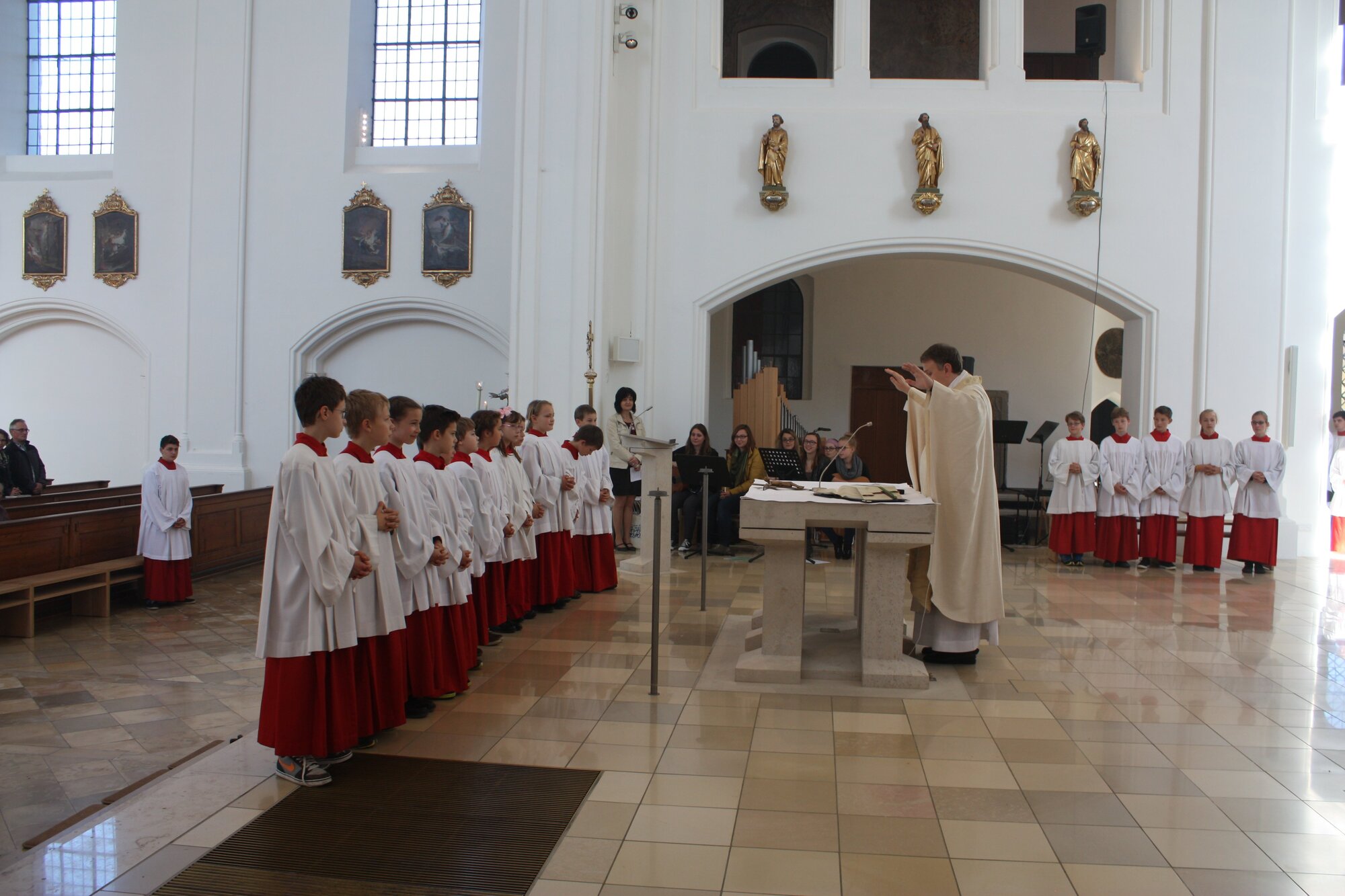 In einem festlichen Gottesdienst wurden am Christkönigssonntag in der Mindelheimer Stadtpfarrkirche St. Stephan 15 neue Ministranten in die Ministrantengemeinschaft aufgenommen. Einer davon engagiert sich dazu in der Studienkirche am Maristenkolleg und ministriert auch dort bei den Gottesdiensten.