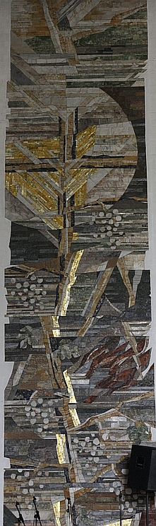 Der Salesianerbruder Benedikt Schmitz aus Ingolstadt hat, wie schon für die Fenster hinter der Altarwand, die Entwürfe für die farbigen Naturstein-Mosaiken gefertigt, die dann in der Franz Mayer'schen Hofkunstanstalt in München ausgeführt wurden. Das linke Mosaik zeigt das Gleichnis vom Sämann, der das Wort Gottes als Samen ausstreut. Das weit geöffnete Buch im oberen Bereich soll ein Hinweis sein, dass Gott sich allen mitteilen will. Das auf der Tabernakelseite angebrachte Mosaik stellt das Gleichnis vom Weinstock dar. Der vom Bildhauer Max Faller gefertigte Kreuzweg wurde auf der Tabernakelseite angeordnet, um als Wegweiser zum Weinstock - also letztlich zum Auferstandenen und im Tabernakel gegenwärtigen Herrn zu führen. Die einzelnen Stationen sind durch ein Band von Mosaiksteinchen verbunden; ebenso die nun auf der gegenüberliegenden Seite angebrachten zwölf Apostelleuchter. Die Reihe der Apostel führt hin zur Mosaikdarstellung des Hl. Ulrich, des Patrons dieser Kirche. |