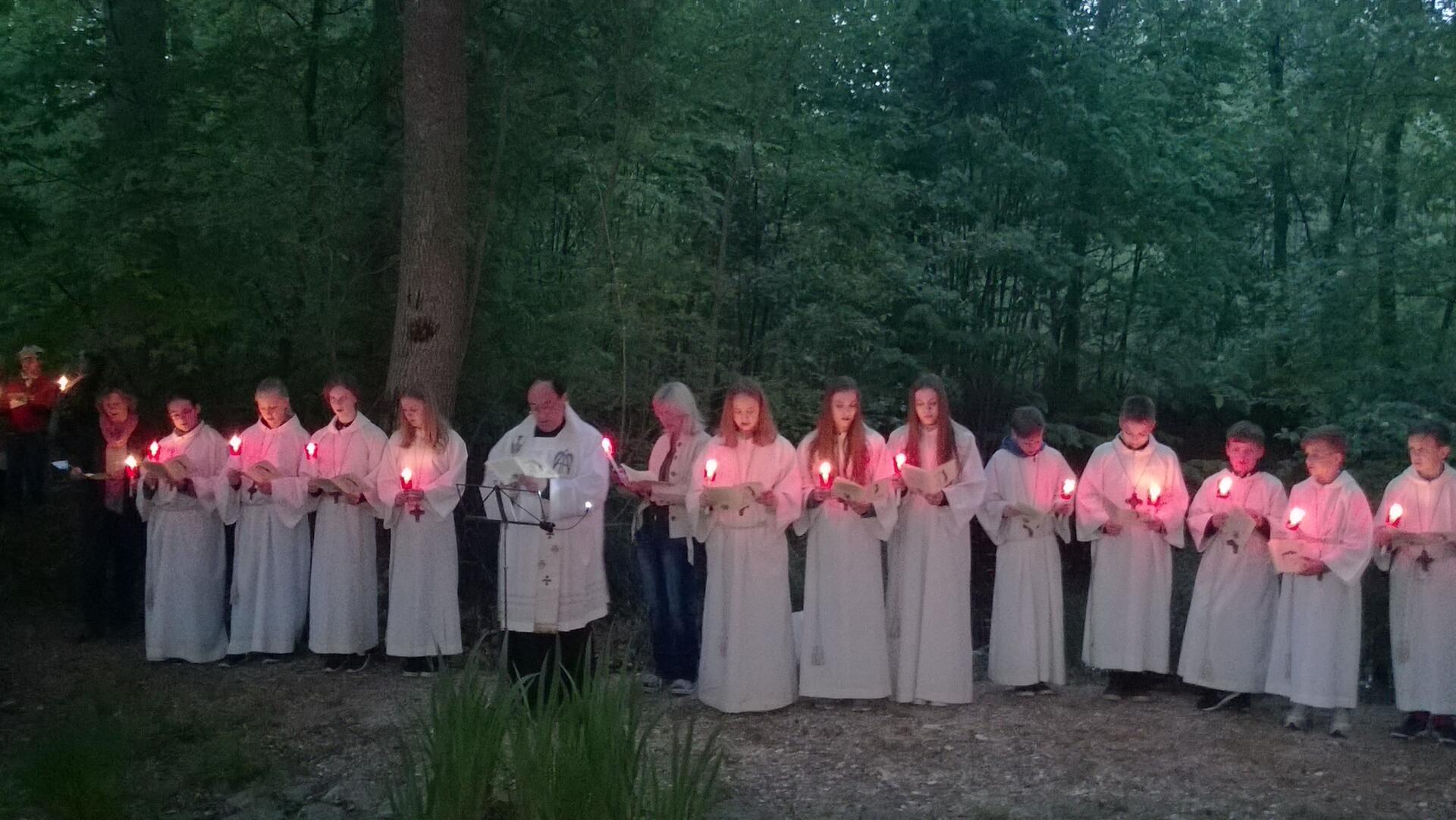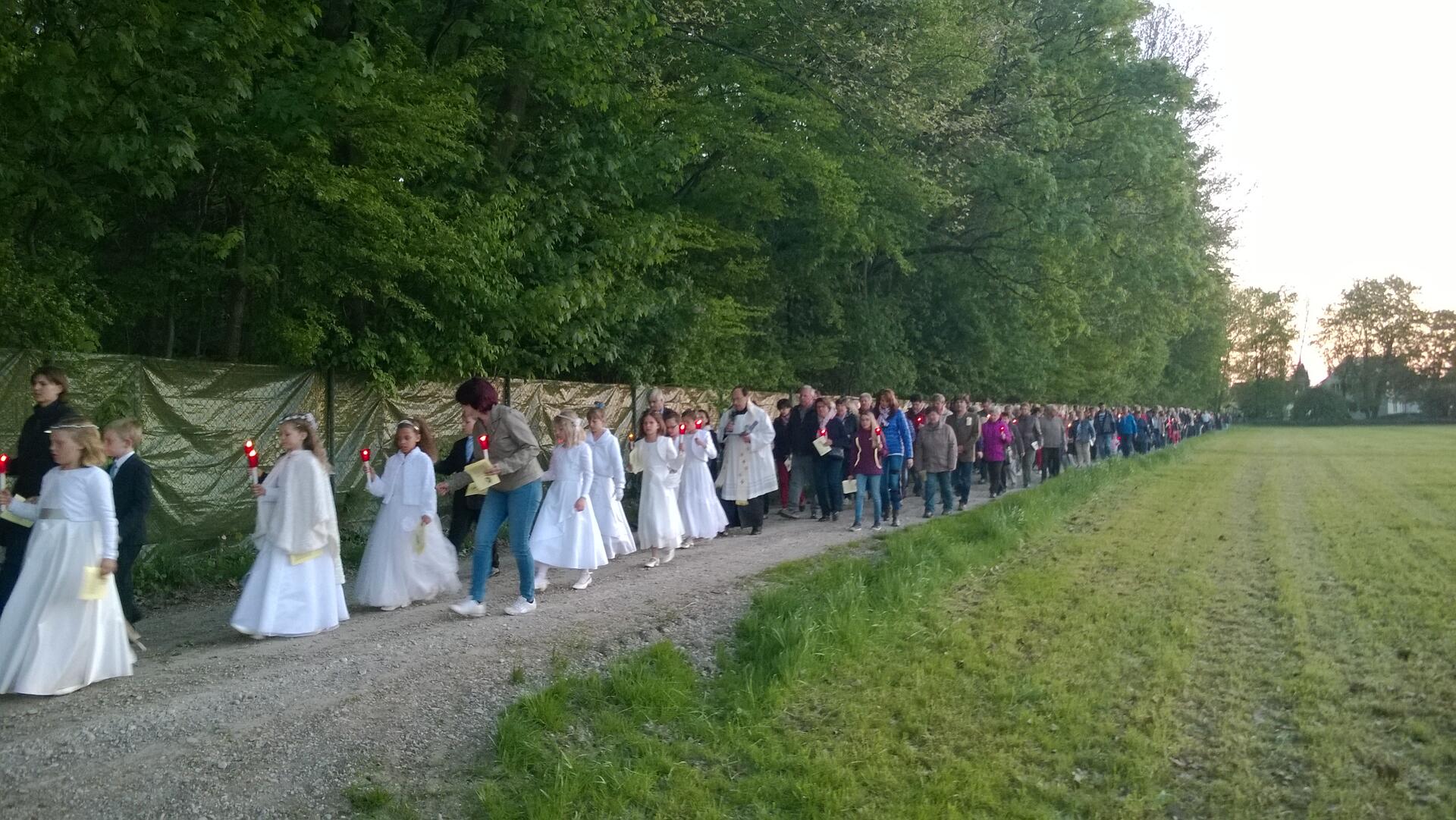 Ca. 350 Gläubige aus nah und fern zogen bei etwas windigem Frühlingswetter, Rosenkranz betend gemeinsam mit H. H. Pfarrer Ivan Novosel, den Ministranten, den Kommunionkindern und deren Eltern zur festlich geschmückten Lourdesgrotte.