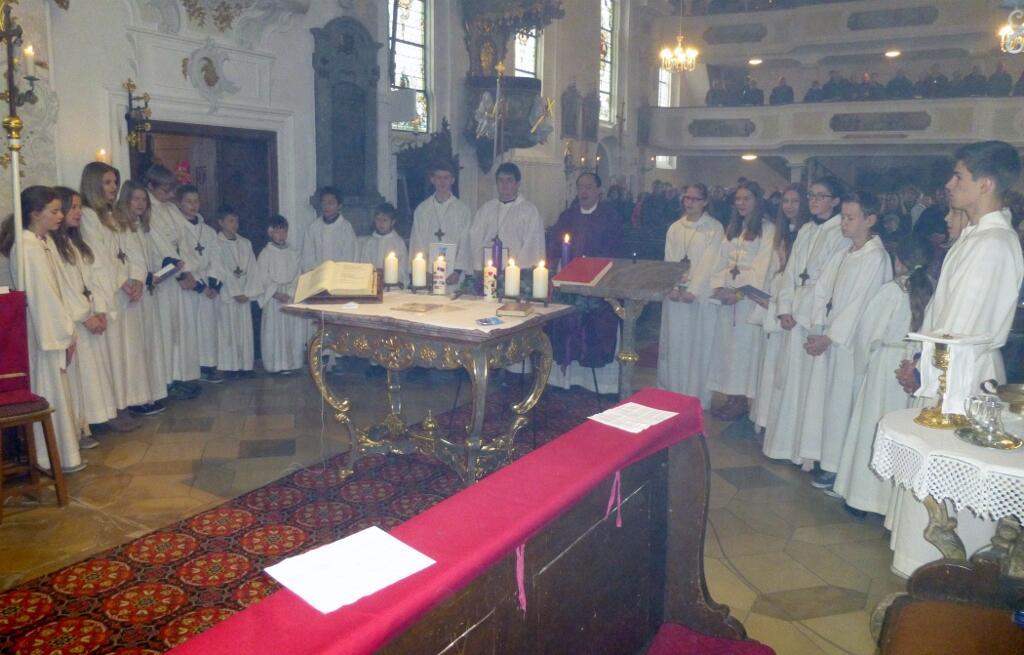 Derzeit befinden sich 19 Ministranten (10 Mädchen und 9 Buben) im Dienste des Herrn in unser Pfarrei St. Nikolaus Oberndorf. Ihre Hauptaufgabe ist das wöchentliche Dienen am Altar zum Sonntagsgottesdienst (abwechselnd 08:45 oder 10:15 Uhr oder zur Sonntagvorabendmesse am Samstag 19:00) sowie am Werktag (Mittwoch 19:00 Uhr). Darüber hinaus finden auch noch besondere Hochfeste wie z. B. Weihnachten, Ostern, Pfingsten, Fronleichnam oder Flurumgang und Lichterprozession zur Grotte statt. Gerne treffen sie sich zur Gruppenstunde, außer in den Ferien meist regelmäßig alle vier Wochen am Freitag um 18:00 zur Gruppenstunde. Diese Gruppenstunde wird hauptsächlich von unserem Gemeindereferenten Herrn Anton Rathgeber geleitet. Bei wichtigen Anlässen bzw. zur Informationsweitergabe ist auch gerne H. H. Pfarrer Novosel mit dabei.