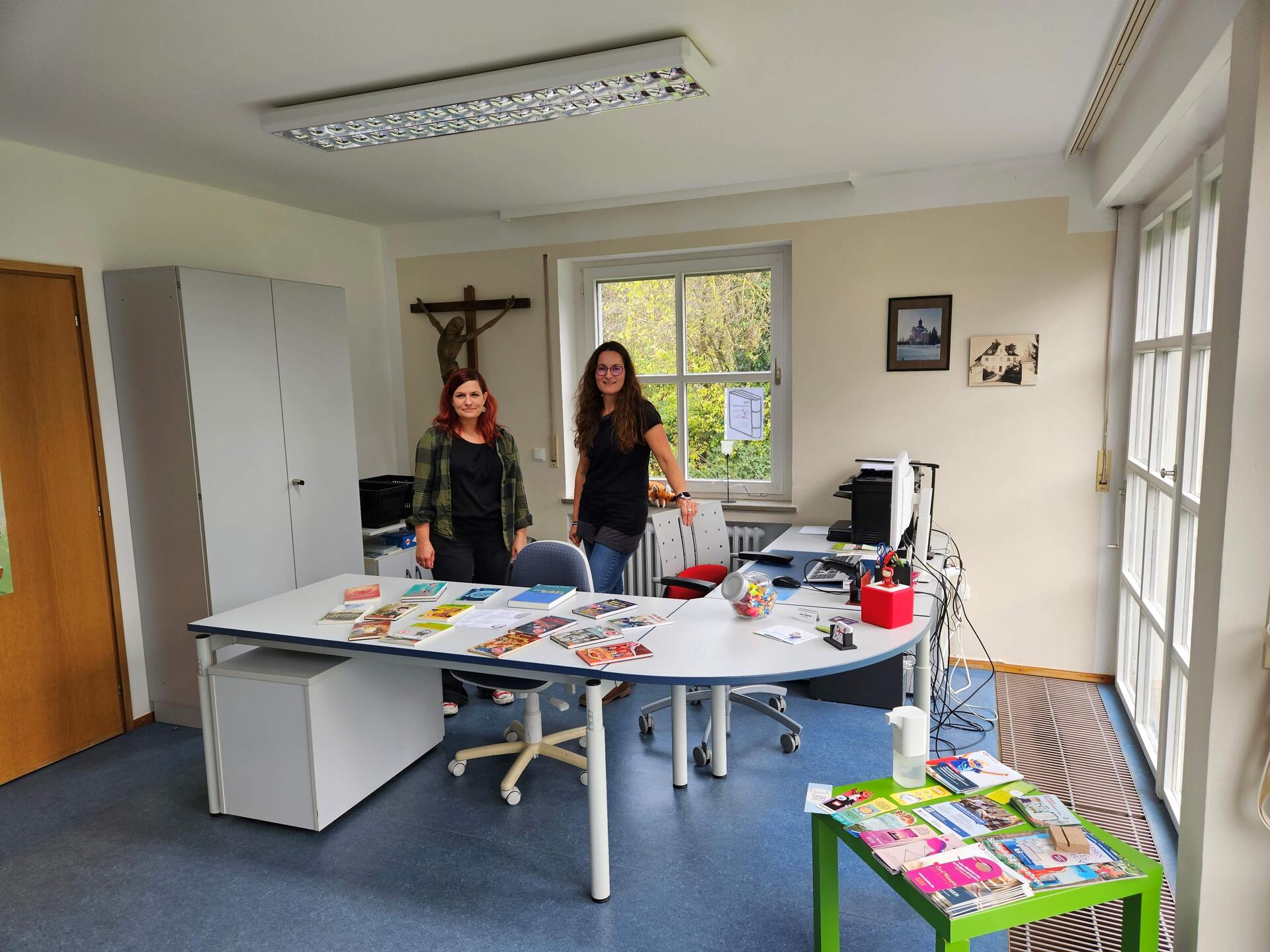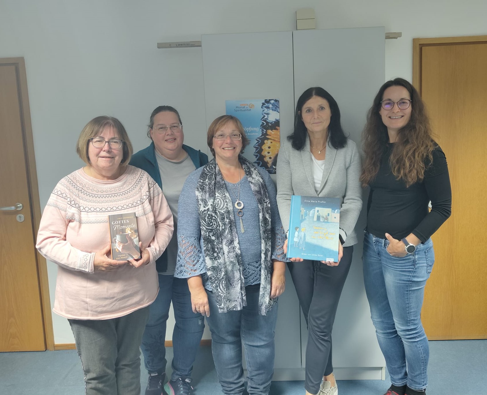 Unsere Pfarrbücherei, im neu hinzugekommenen Erdgeschoss und im 1. Stock des ehemaligen Pfarrhauses wird aktuell von den 6 ehrenamtlichen Mitarbeiterinnen: Waltraud Wiedemann, Esther Bender, Martina Kolb, Christine Baar, Melanie Baar und der Leiterin Ingrid Scheller betreut.