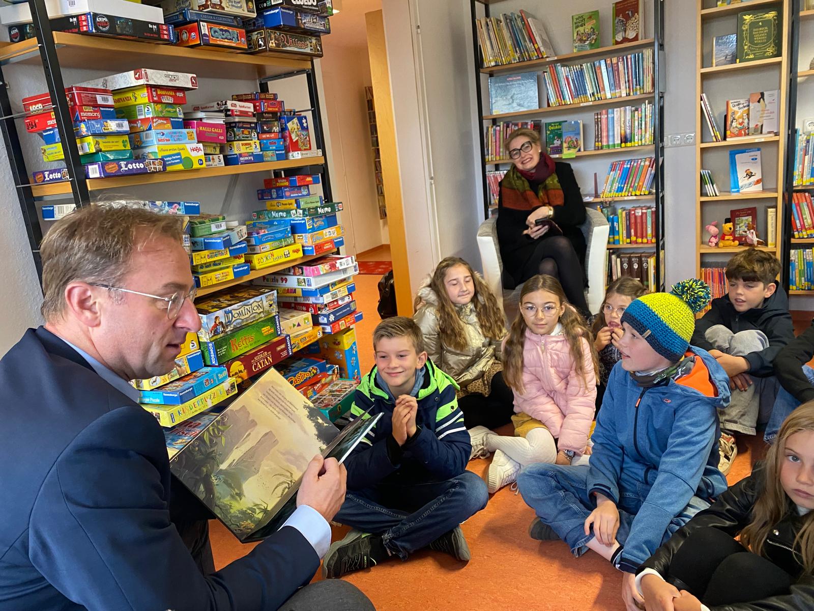 Die Vorlesestunde mit MdL Wolfgang Fackler zum Thema Demokratie besuchte die 4. Klasse der GS mit Rektorin Frau Petra Wirth.