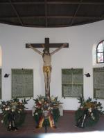 Den Innenraum beherrscht der um das Jahr 1500 in der Ulmer Schule des Jörg Syrlin geschaffene spätgotische Christus. Die ausgespannten Arme des lebensgroßen Heilandes, dessen ausdrucksstarkes Gesicht sich einprägt, beschirmen gleichsam die Namen der in den beiden Weltkriegen Gefallenen und Vermißten, die auf den steinernen Tafeln verzeichnet sind. |