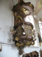Kanzel um 1760 mit den Symbolen der 4 Evangelisten: Engel, Löwe, Stier und Adler |