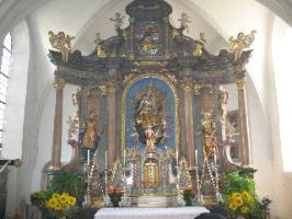 Hochaltar mit Marienfigur Aufschrift: Ach Heilige Maria von Straß, |