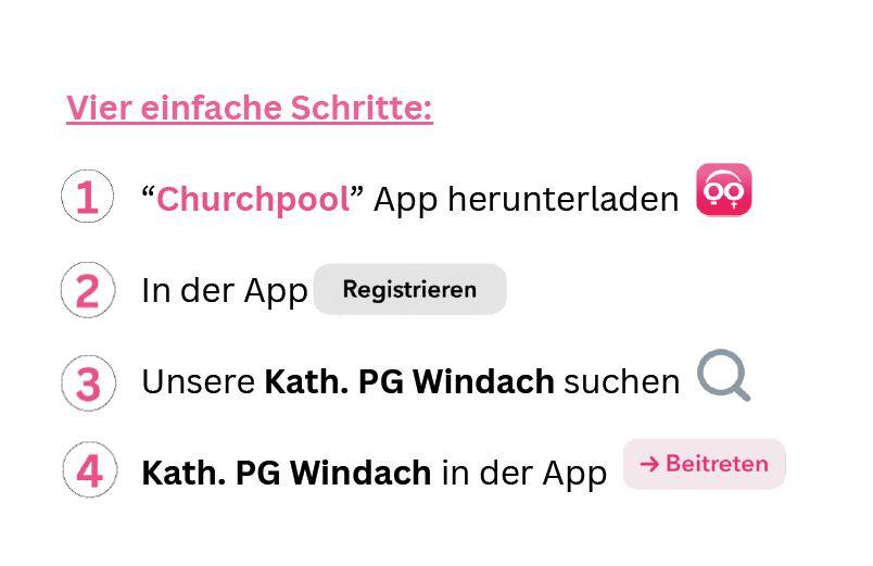 Die Pfarreiengemeinschaft Windach geht neue Wege und vernetzt sich ab jetzt über die App Churchpool. Ob aktuelle Gottesdienste, Veranstaltungen, gemeinsame Gebetsanliegen oder spontane Helferanrufe - mit einem Fingertipp bist du mittendrin im lebendigen Leben unserer Pfarreien. Einfach. Direkt. Miteinander.