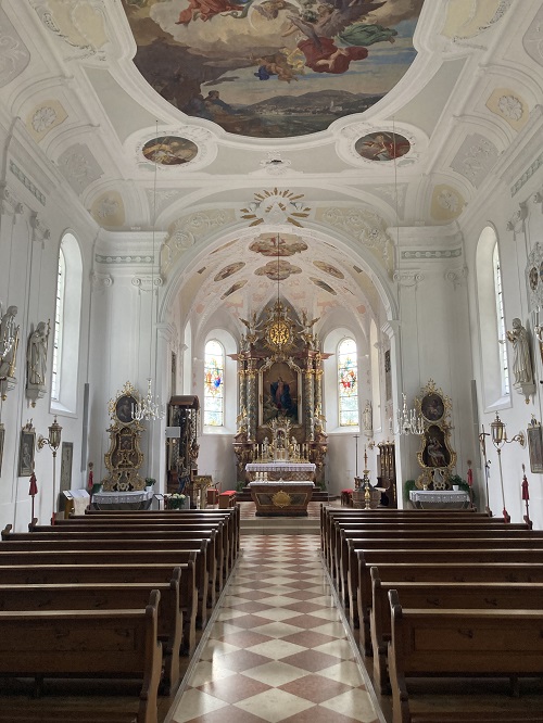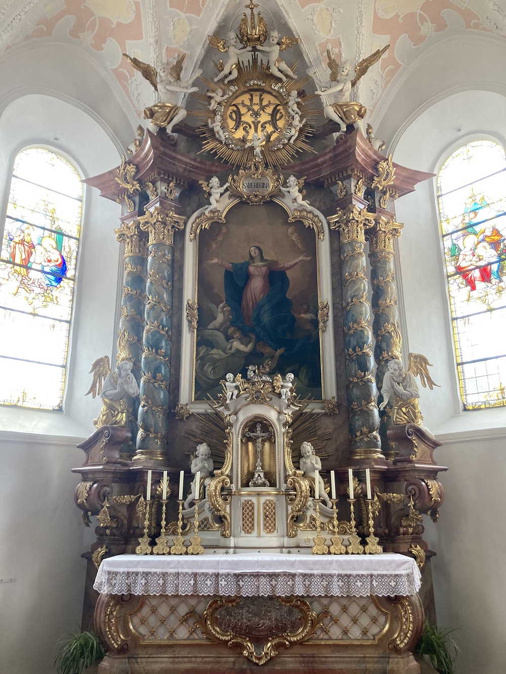 Das Altarbild über dem neubarocken Hochaltar stellt die Himmelfahrt Mariens dar. Das Bild wurde von Johann Baptist Dollenbacher (1815-1866), einem hochbegabten Künstler aus Unterbleichen, nach einer Vorlage des italienischen Künstlers Guido Reni geschaffen. Ganz besondere Schmuckstücke der Kirche sind die beiden Seitenaltäre. Linker Hand befindet sich, eingefasst in einen Rocaillerahmen mit den typischen muschelförmig ausgeführten Ornamenten, das Bild Maria vom guten Rat. Der rechte Seitenaltar beherbergt eine ebenso beeindruckende wie anmutige Pietà. Beide stammen aus dem 18. Jahrhundert und sind eine Dauerleihgabe des früheren Patronatsherrn, Baron von Aretin.
