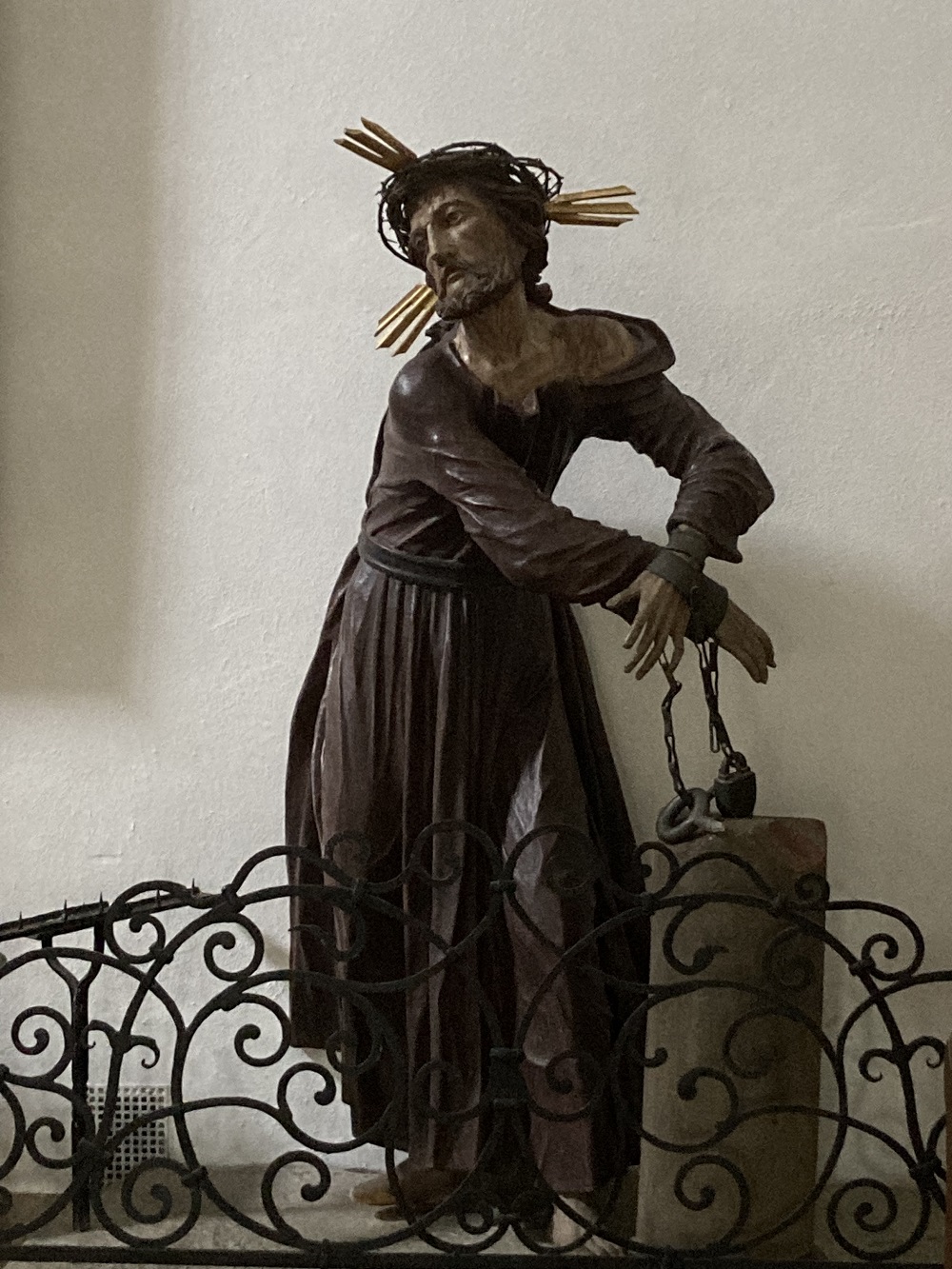 Beeindruckend und gleichsam nachdenklich stimmend ist auch der lebensgroße Geißelheiland, der sich im rückwärtigen Teil des Langhauses befindet. Jesus, angekettet an die Geißelsäule, die Dornenkrone auf dem Haupt, verwundet und gequält. Er verkörpert die Leiden, die Christus für die Erlösung der Menschheit auf sich genommen hat.