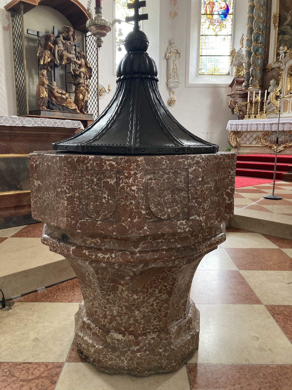 Der aus rotem Marmor bestehende Taufstein stammt aus dem Jahre 1475. Er ist somit älter als die Kirche selbst und ist auch das älteste Inventar in der Neuburger Pfarrkirche. Wer vor dem Taufstein steht, und um sein Alter von mehr als einem halben Jahrtausend weiß, frägt sich unwillkürlich, was wohl aus all denen geworden ist, die mit dem Weihwasser aus dem Neuburger Taufstein in die Christliche Gemeinschaft aufgenommen worden sind. Vielleicht wurde ja auch Christoph Rodt über diesem Stein getauft, und hätte so mit der Gruppe der Kreuzabnahme zwar nicht in seine Taufkirche, aber doch in seine Heimatkirche zurück gefunden.