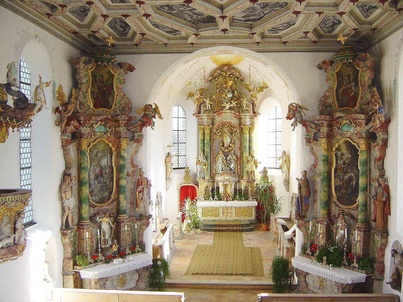 So zeigt sich die Kapelle heute mit einem romanischen Turm, einem gotischen Chorraum, einer Kassettendecke mit Grisaillemalereien und hübschen Rokokoaltären. Die Figuren am Hochaltar sind Werke des Füssener Bildhauers Anton Sturm. Etwa Mitte des 17. Jahrhunderts wurde unter Pfarrer Jakob Glaser die Sakristei angebaut.