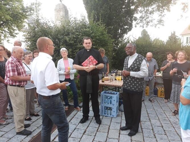 Beim Stehempfang am Kirchenvorplatz wurde Pfarrer Felix auch von der Pastoralratsvorsitzenden, Frau Anni Kiser, verabschiedet. Sie überreichte ihm ein Fotobuch mit Bildern aus dem Jahr in unserer Pfarreiengemeinschaft. Auch der 1.  Bürgermeister von Ried, Erwin Gerstlacher,  verabschiedete sich von Pfr. Felix und überreichte ihm eine Spende der Gemeinde Ried für seine Kirche in Nigeria.