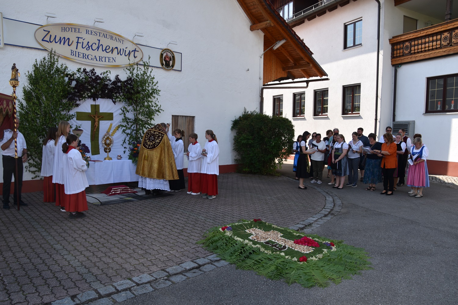Nach dem Hochamt, zelebriert von Offizialatsrat Joachim Kunz, wurde das Allerheiligste durch Baindlkirch getragen, begleitet von den Kommunionkindern, den Fahnenabordnungen der Vereine, dem Kirchenchor Baindlkirch und den Gläubigen.