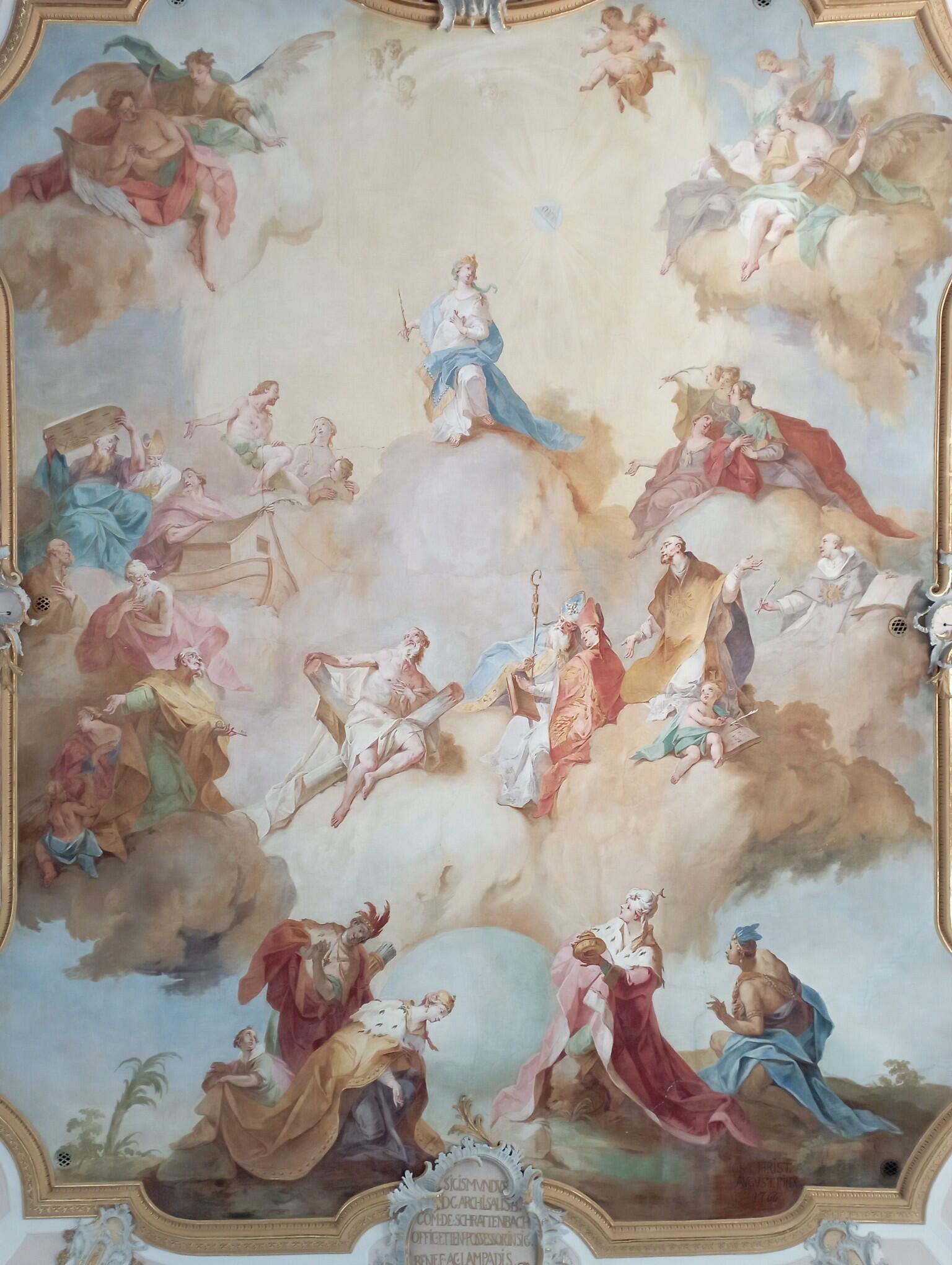 Drei Künstler gaben Zeugnis ihres Könnens bei der Ausgestaltung der Decke. Es ist zum einen der bekannte Allgäuer Bauernsohn Joseph Christ. Er schuf ursprünglich beide Deckenfresken, im Langhaus stellte er die Huldigung Mariens dar, die Kreuzwegstationen an den Wänden und die Grisaillen an den Wänden mit den vier Evangelisten im Chor, im Langhaus, nördlich: Hl. Anna und Joachim (die Eltern von Maria), dazwischen das Herz Jesu. Südlich: Elisabeth mit dem Johannnesknaben und Hl. Zacharias (den Eltern von Johannes dem Täufer). Das Fresko im Chor wurde im vorigen Jahrhundert beschädigt und wurde um 1900 von August Müller aus Warth in der Schweiz als „Aufnahme Mariens in den Himmel“ neu gestaltet. Der Rokokostuck von 1766, also der Endzeit des Neu- und Umbaus wird Johann Michael Hoiß zugeschrieben. Die Wappenkartusche über dem Chorbogen ist dem großen Umbauförderer Erzbischof Sigismund Christoph von Schrattenbach aus Dankbarkeit gewidmet. Ihre Inschrift lautet: Sigismund D.G. Archi. Salisb. Com. de Schrattenbach offic. Etten. possessor insig. benef. ac lampadis fundator insignis (Gräflich Schrattenbachisches Wappen 1766).