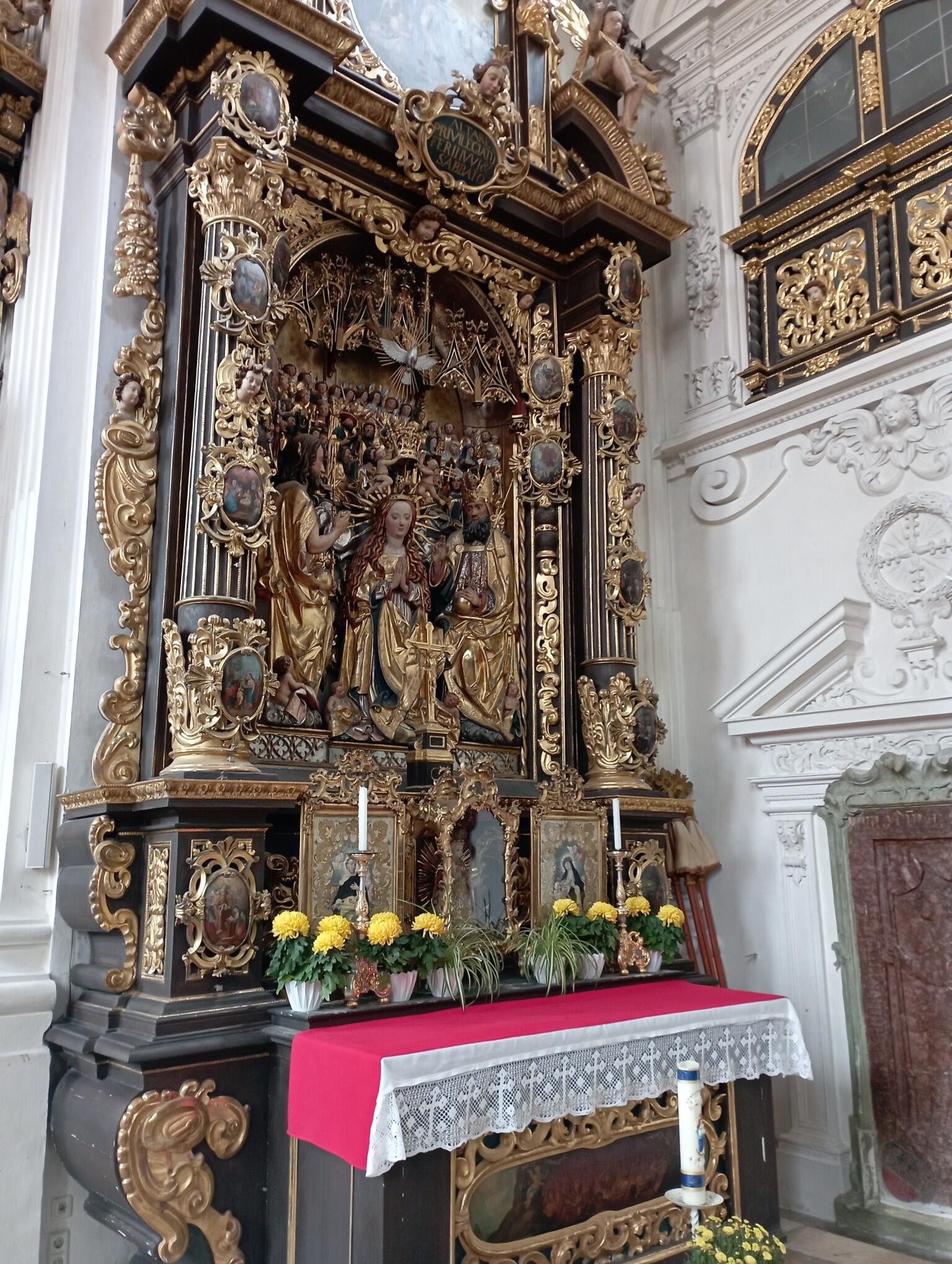 Das Pendant auf der rechten Seite birgt den Bruderschaftsaltar (vulg. "Marienaltar") der 1640 gestifteten Rosenkranzbruderschaft. Das Mittelfeld stammt aus dem ehemaligen gotischen Hochaltar der Klosterkirche. Der Ulmer Schule zugehörige Martin Schaffner ist Urheber des Altars, welcher 1524 angefertigt wurde. Der prächtige Altar - eingerahmt von auf Blech gemalten Rosenkranzgeheimnissen - ist letzter Höhepunkt des Künstlers und mag nicht darüber hinwegtäuschen, dass Deutschland im Allgemeinen und Schaffner im Speziellen nicht mehr auf der Höhe ihrer Zeit waren. Die allgemeine Krise mit der alles erfassenden Reformation findet ihren Wiederhall auch in der Kunst. Nichts desto trotz staunen wir über diesen Altar, dessen gemalte Flügel heute in der Alten Pinakothek zu finden sind.