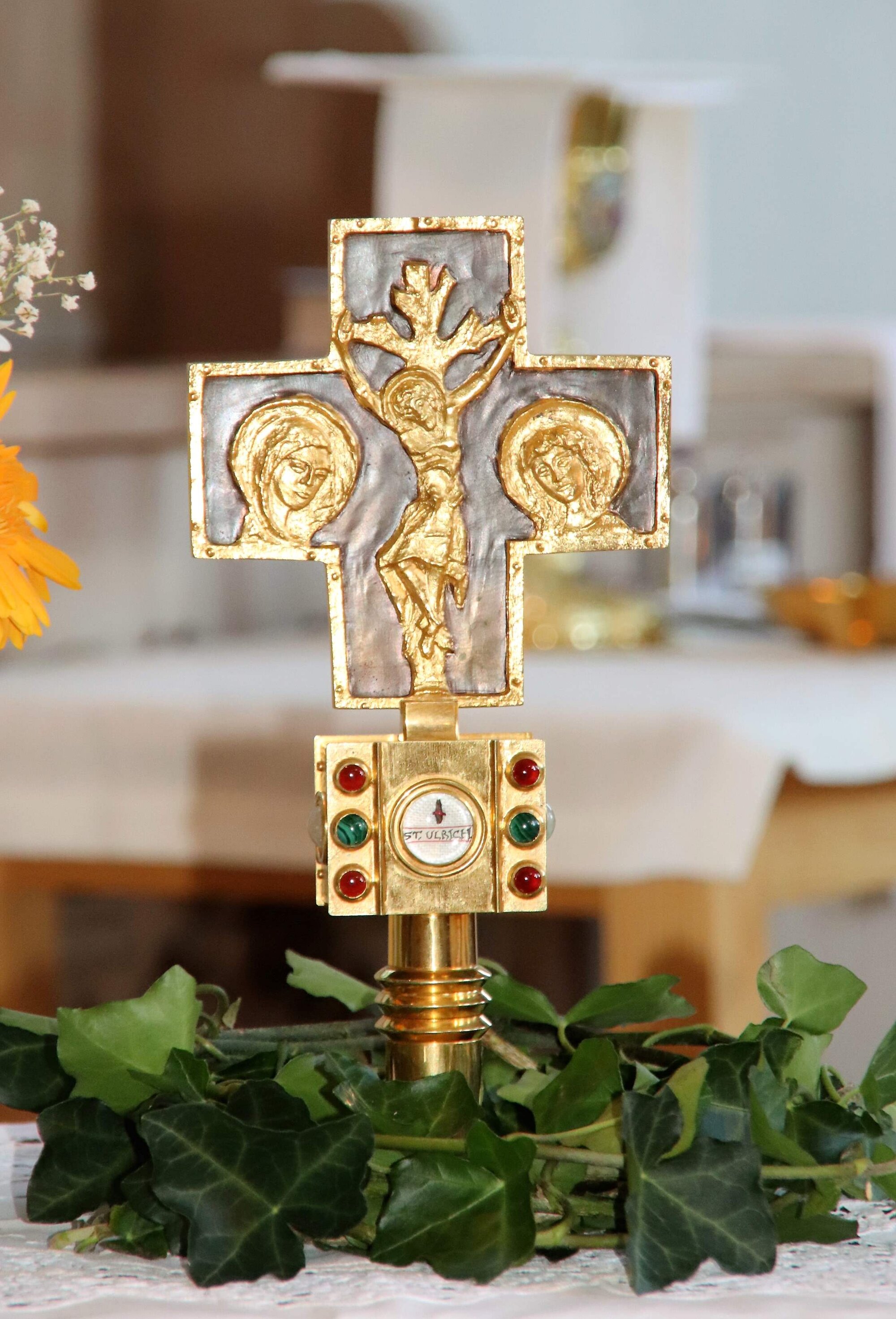 Im Mittelpunkt des Stehkreuzes ist, in wertvollem Gehäuse mit einem Schauglas, ein winziges Stückchen des Ulrichsholzes eingelassen, welches das Grab des Heiligen bedeckte, bis dessen sterbliche Überreste im Jahr 1187 im Zuge des Neubaus der damaligen Kirche St. Ulrich und Afra umgebettet wurden.