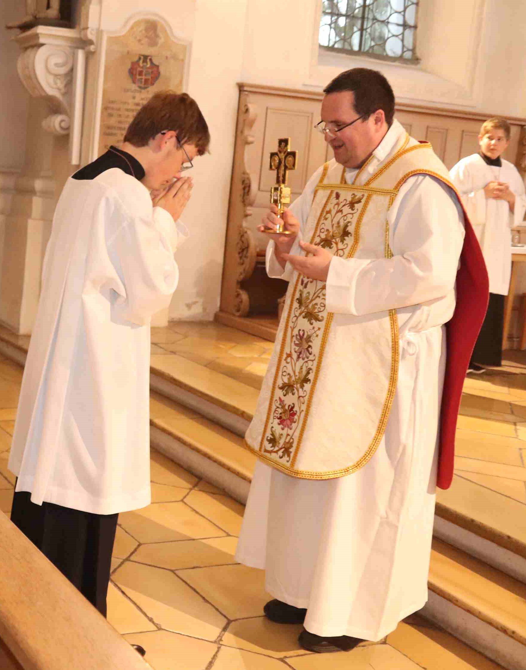 Am Ende des Festgottesdienstes in St. Magnus gab Pfarrer Simon Fleischmann den Gläubigen den Einzelsegen mit dem Ulrichskreuz.