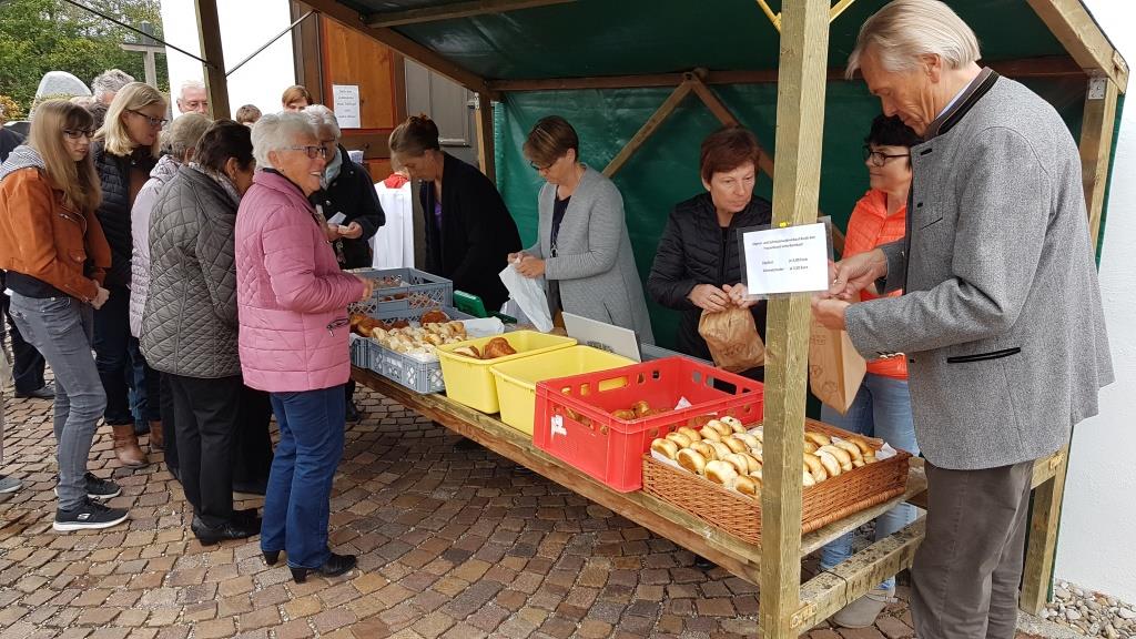 Nach dem Festgottesdienst mit Pfarrer Karl Bartenschlager am Kirchweihsonntag verkauften Mitglieder des katholischen Frauenbunds Unterbernbach vor der Kirche wieder Schmalznudeln und Zöpferl, die reissend Absatz fanden.