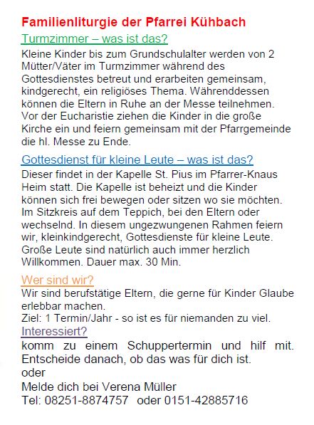 In der Pfarrkirche in Kühbach wird in regelmäßigen Abständen eine Kinderbetreuung während des Sonntagsgottesdienstes angeboten.