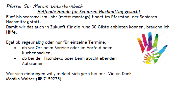 Seniorenkreis Unterbernbach – Aufruf - "Helfende Hände"