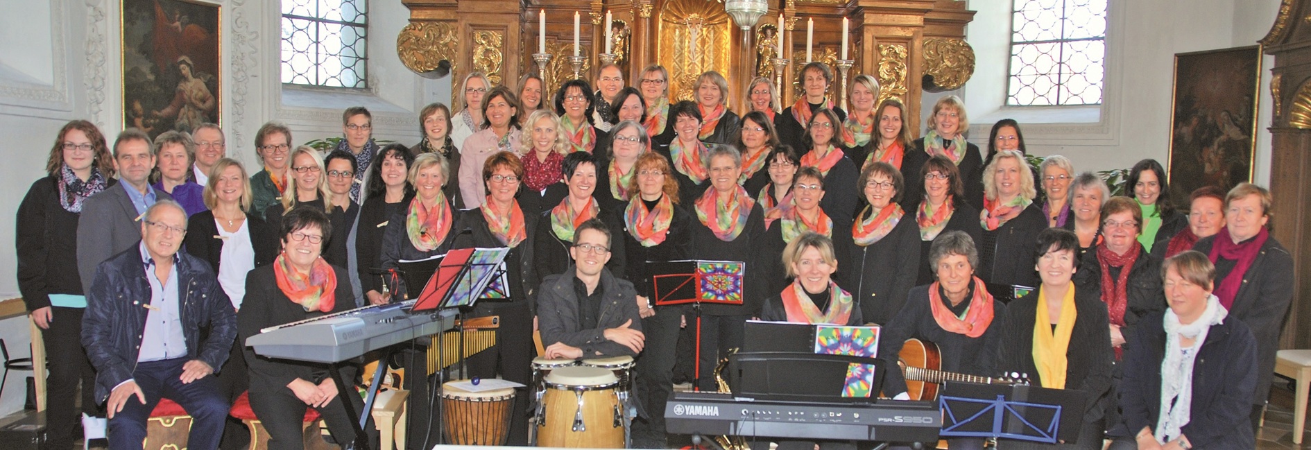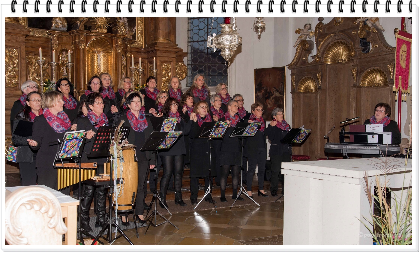 Claudia Golling führte mit kleinen Geschichten zum Chorgeschehen und mit kurzen Erläuterungen zu den vorgetragenen Liedern durch das Programm. Mit einer Auswahl von Liedern, deren Text zum besinnlichen Zuhören, die Instrumentalen Melodien still zum Lauschen, oder der Titel „ja alles was atmet, danke Gott“ rhythmisch zum Mitklatschen ermunterten waren die Zuhörer begeistert. Lieder wie Halleluja, in der Kaleidoskop Version mit der Kirchenakustik, erzeugten bei so manchen in den Kirchenbänken Gänsehaut. Eines der Liedertitel von Kaleidoskop heißt „Miteinander sind wir Ton in Ton“. Möglicherweise ist dies sichtbares Zeichen aller schwarz mit farbigen Halstüchern gekleideten 27 Sängerinnen und die Freude an den Tönen beim Singen das Geheimnis des Chores. Mit dem Lied „Pace e Bene – Frieden und Heil“ ging das gelungene und mit viel Applaus bestätigte „10 Jahre Kaleidoskop“ Konzert, natürlich nicht ohne Zugabe, zu Ende.