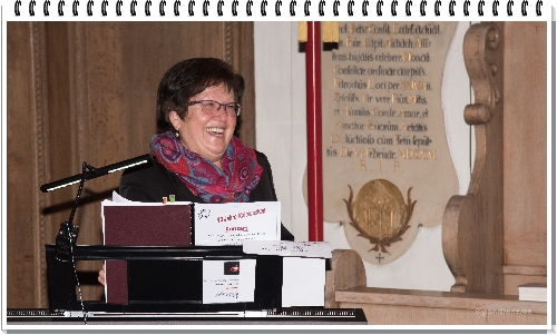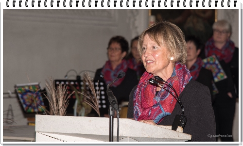 Bei der Begrüßung und dem Vorwort zur Entstehung des Chors, den vielen Auftritten, viel Spaß bei den Ausflügen aber auch die Betroffenheit, wenn der Platz von einer verstorbenen Sängerin plötzlich leer ist, wurde von Claudia Golling beschrieben. Chorleben ist mit viel Disziplin, Zeit und wie bei der Teilnahme an den Weltgebetstagen auch Probenstress verbunden. Hier wird oft, in nicht für jedermann geläufiger Sprache, erst mal der Text gelernt, dann die Stimmen und der Rhythmus zusammengefügt.