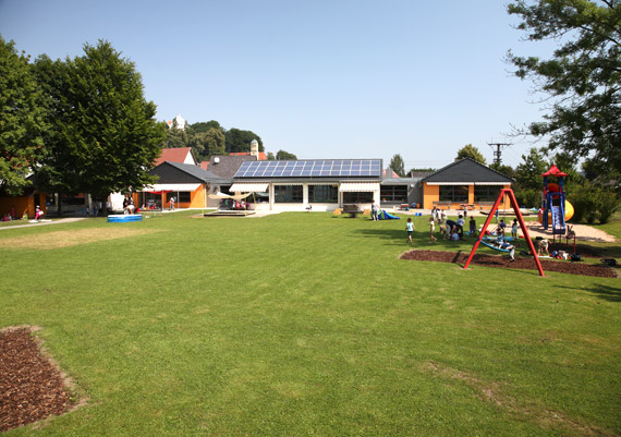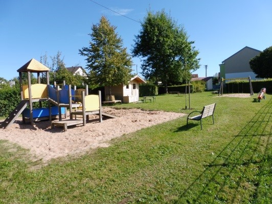 Ein großzügig angelegter Garten mit Schatten spendenden Bäumen, Rutschen, Schaukeln, Wippe, Klettergerüst, Reifenschaukel, Balancierbalken, mehreren Sandkästen, Spielhaus und Spielstraße bietet den Kindern viele Möglichkeiten zum Spielen, Toben und Erleben.