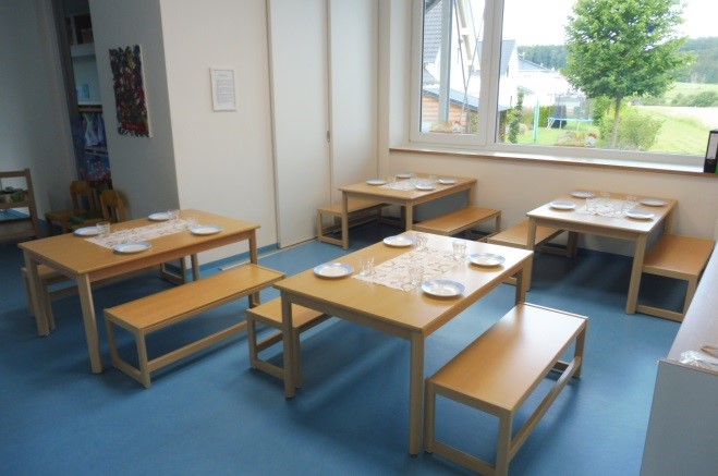 In der angenehmen Atmosphäre des Bistros sitzen die Kinder am gedeckten Tisch, um ihr Frühstück, bzw. ihr Mittagessen einzunehmen. Die Kinder erhalten die Möglichkeit ihre Tischgemeinschaft selbst zu wählen und in der Gemeinschaft der Stammgruppe und den Erziehern zusammen zu essen. Sie erlernen unsere abendländische Tisch- und Esskultur kennen. Es werden alle Mahlzeiten gemeinsam eingenommen, um den sozialen Aspekt des Gemeinschaftserlebnisses zu stärken. Gemeinsame Mahlzeiten stellen für uns ein kulturelles, soziales Erleben in familiärer Atmosphäre dar. Hierbei ist es uns wichtig, dass die Kinder ihrem eigenen Tempo essen können und die Speisen und Mengen selbst wählen. Dadurch lernen sie, ihr Sättigungsgefühl selbst richtig einzuschätzen und zu regulieren.