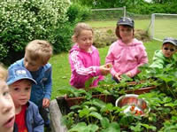 Wir beziehen die Kinder bei allen Gartenarbeiten mit ein. Durch das Bepflanzen des Hochbeetes kommen die Kinder in Kontakt mit dem Agrarökosystem. Der Hausgarten lädt ein, gesundes, frisches Obst, Gemüse, Kräuter, Duft- und Heilpflanzen kennenzulernen. Gesunde Ernährung gewinnt an Bedeutung.