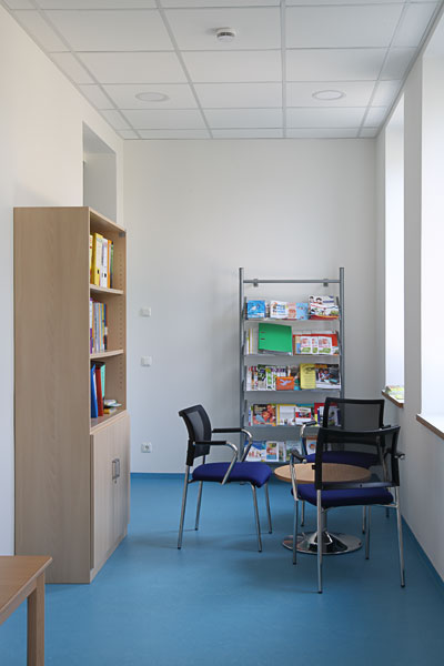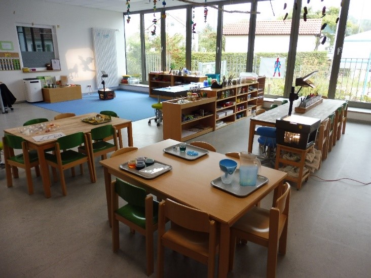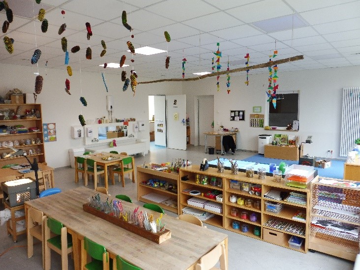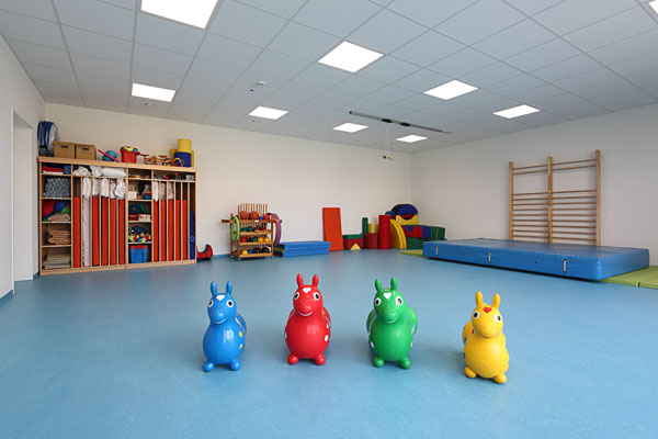 Dazu kommen Garderobe, sanitäre Anlagen für Kinder und Erwachsene, mehrere Materialräume, Büro, Besprechungszimmer und Küche.