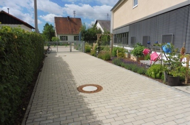 Der Hof des Kindergartens besteht aus einer kleinen, gepflasterten Fläche. Hier stehen den Kindern verschiedene Fahrzeuge zur Verfügung (keine Fahrräder). Kinder, die mit dem Fahrrad in den Kindergarten kommen, können diese im Hof abstellen. Die Kinder dürfen mit den Rädern im Kindergarten nicht fahren, da die befahrbare Fläche sehr beengt ist und den Kleinkinderfahrzeugen vorbehalten ist.