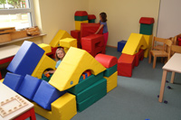 Während der Freispielzeit dient er als Rückzugs- und Begegnungsraum, außerdem laden große Softbausteine zum kreativen Bauen ein.