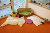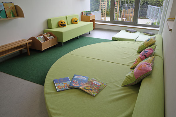 Hier ziehen sich die Kinder zur Bilderbuchbetrachtung oder Körperwahrnehmungsspielen zurück. Auch können sie dort ihrem aktuellen Bedürfnis nach Ruhe nach kommen oder mit etwas Distanz miterleben, was die anderen machen.